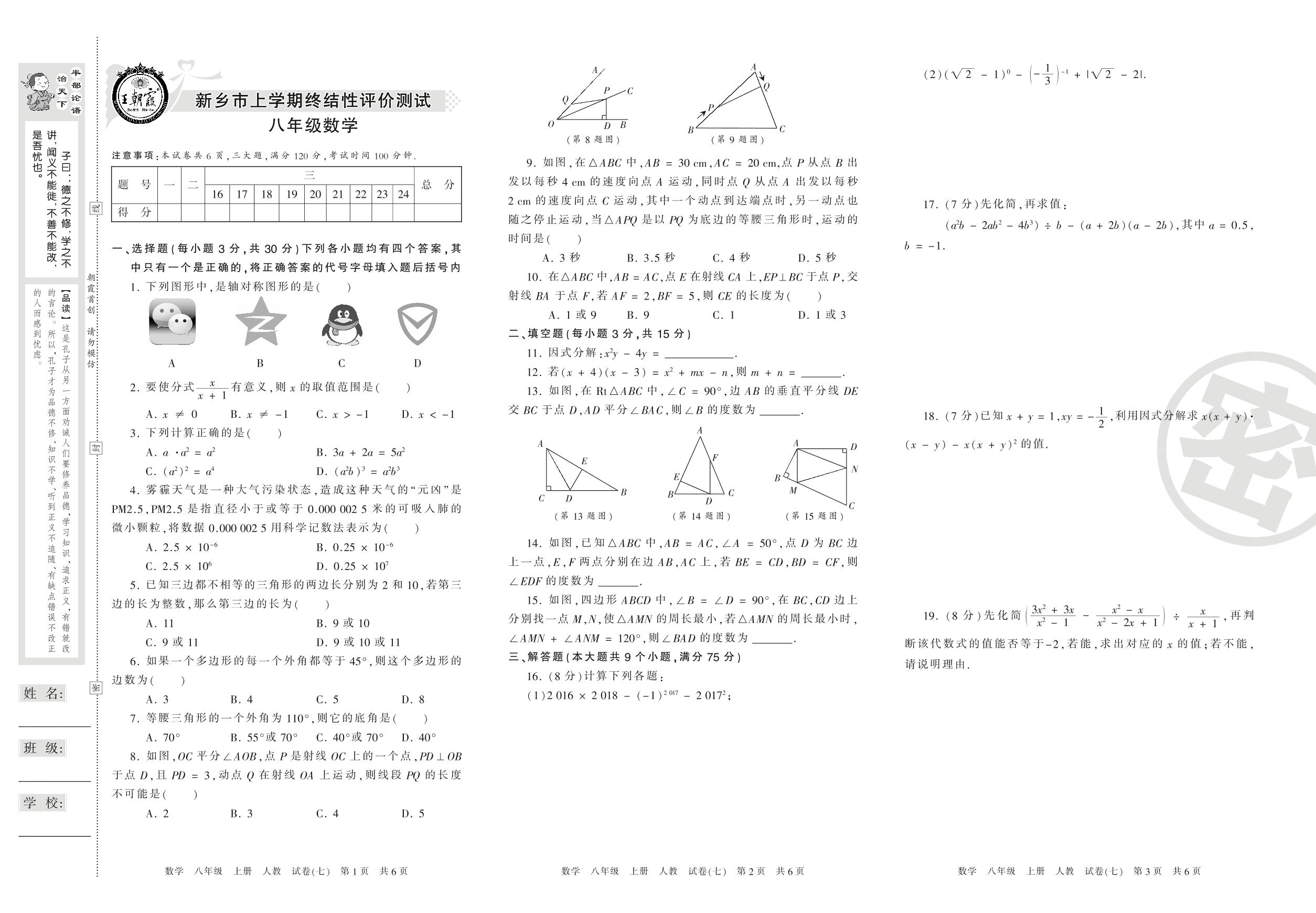2016-2017学年第一学期新乡市八年级数学试卷(人教版)【7】