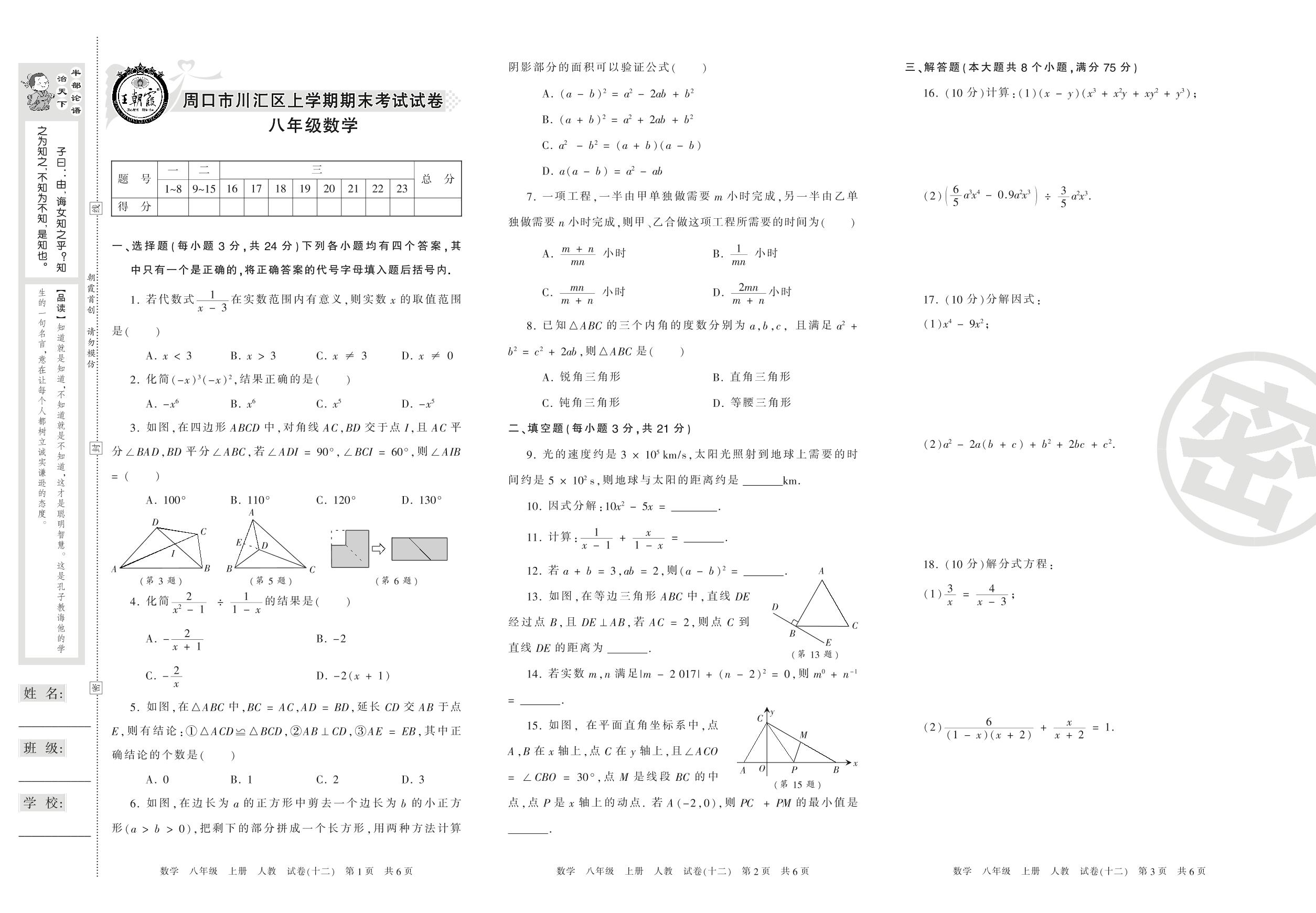 2016-2017学年第一学期周口市川汇区八年级数学试卷(人教版)【12】
