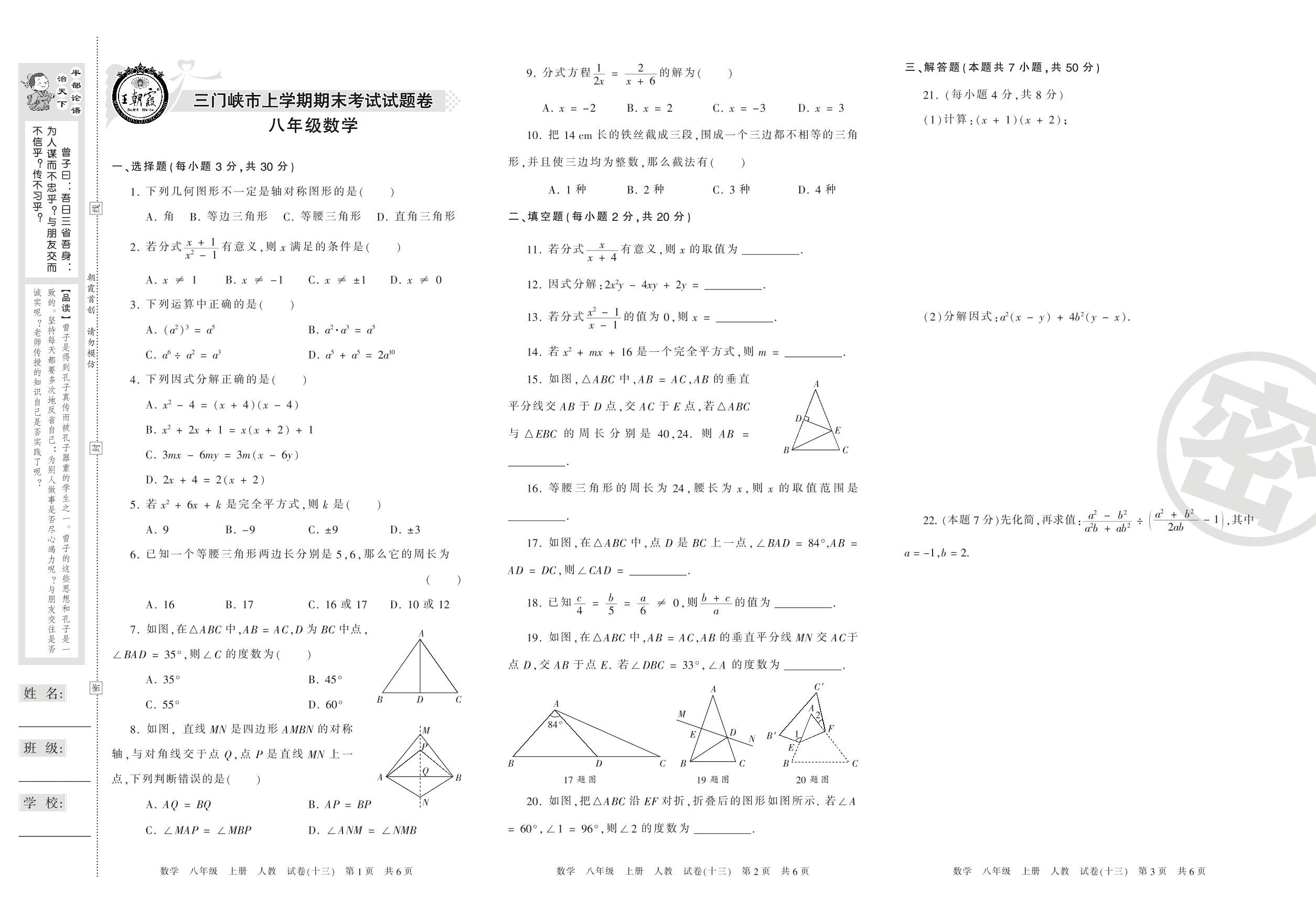 2016-2017学年第一学期三门峡市八年级数学试卷(人教版)【13】