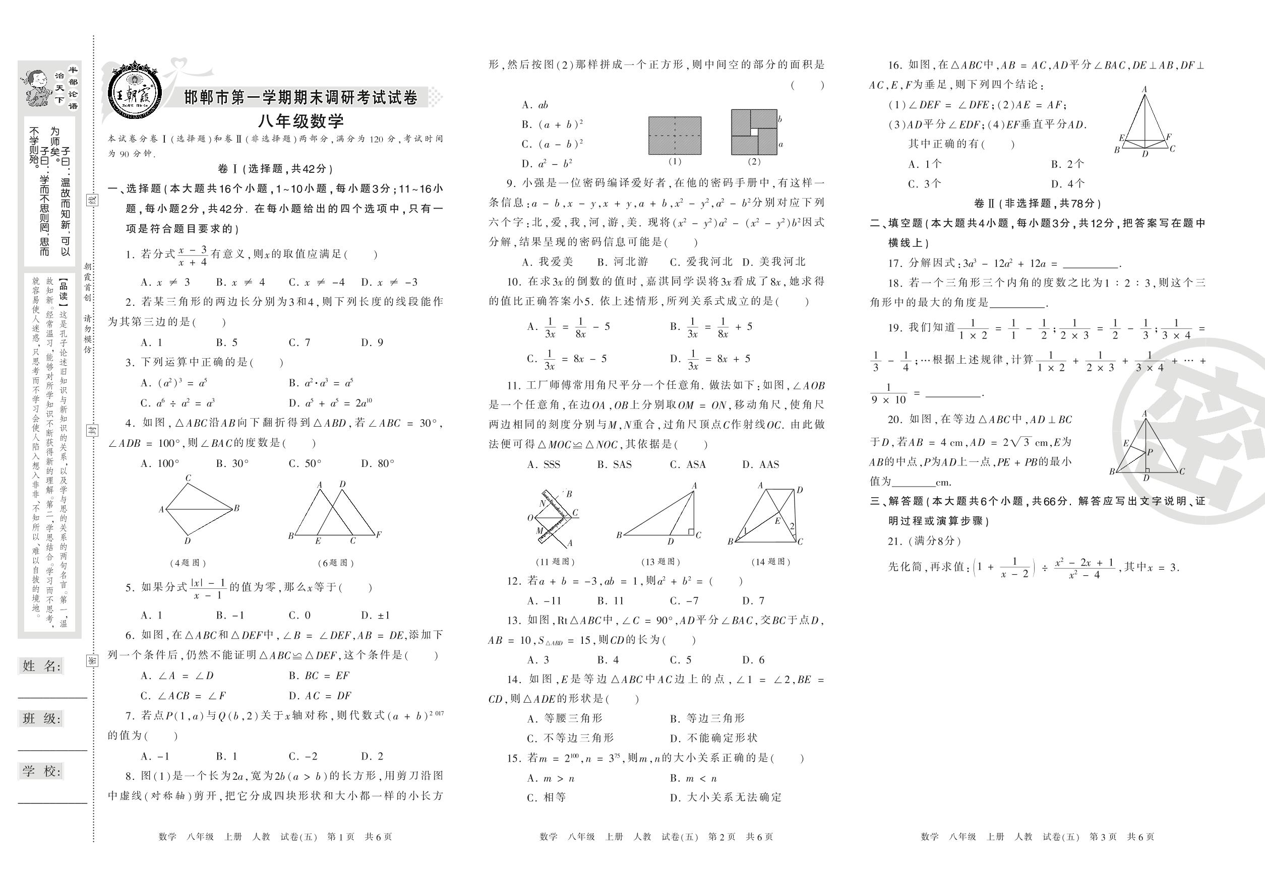 2016-2017学年第一学期邯郸市八年级数学试卷(人教版)【5】