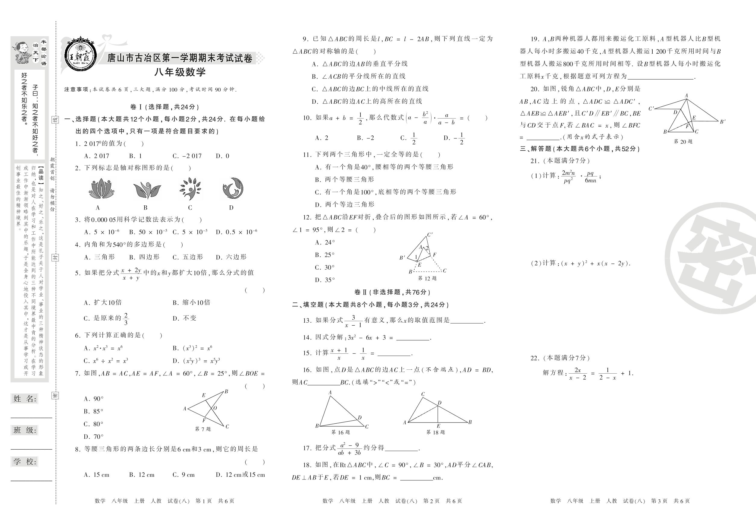 2016-2017学年第一学期唐山市古冶区八年级数学试卷(人教版)【8】