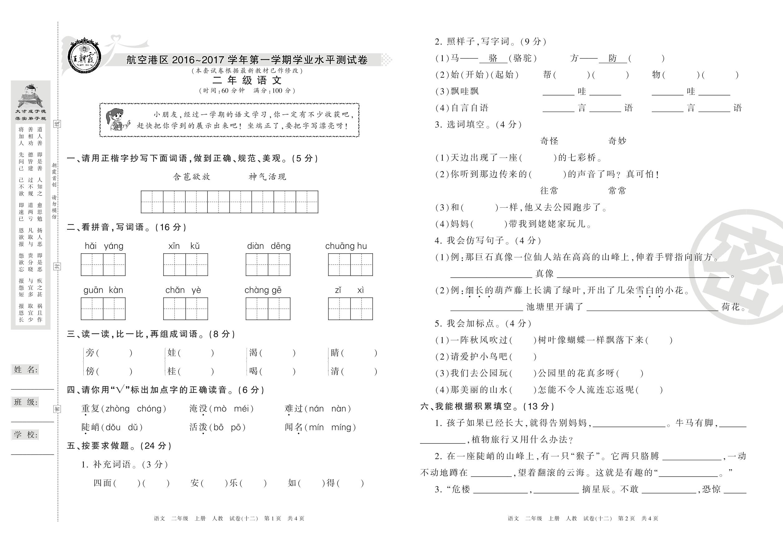 2016-2017学年第一学期郑州市航空港区二年级语文试卷(人教版)【12】