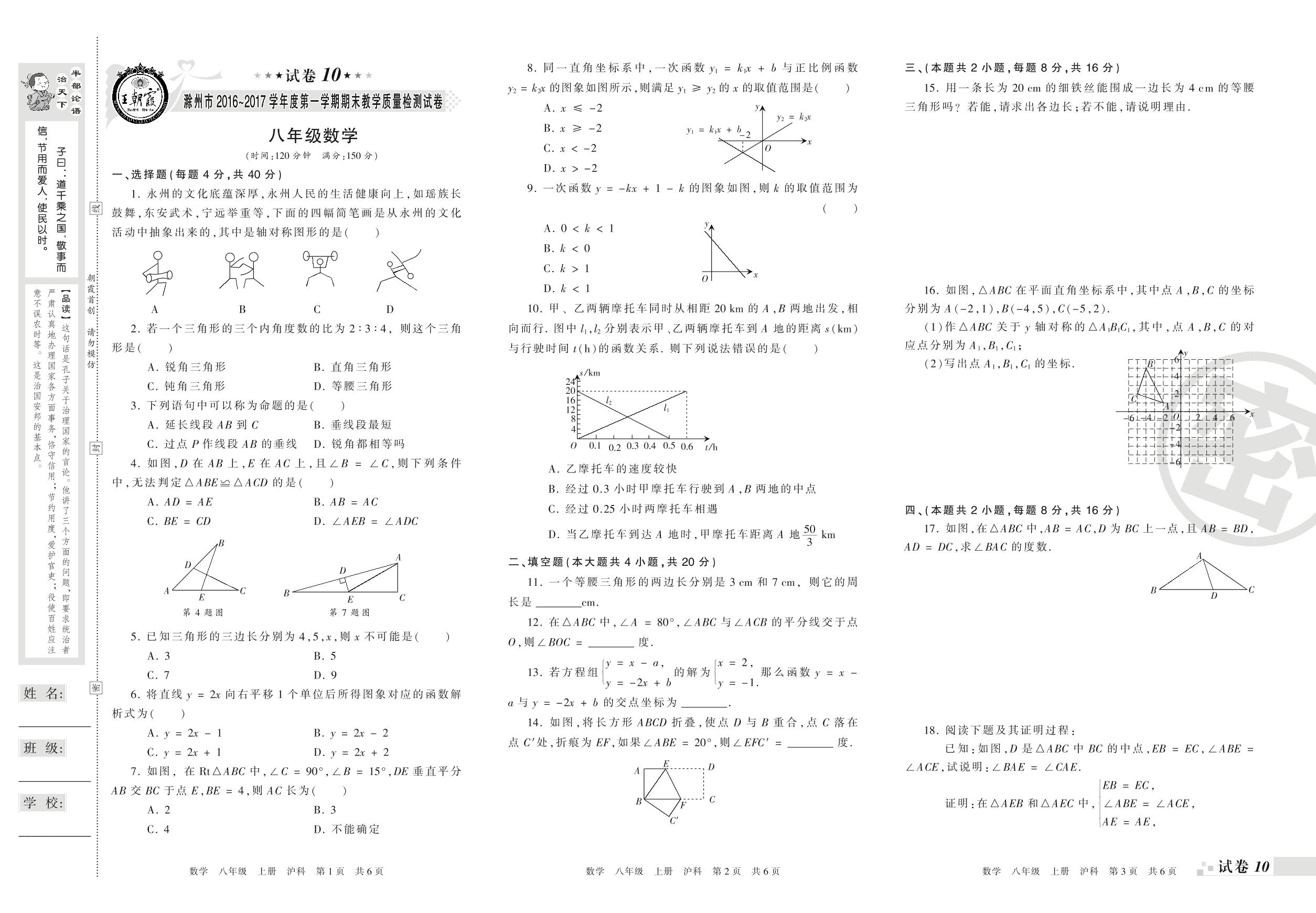 2016-2017学年第一学期滁州市八年级数学试卷(沪科版)【10】