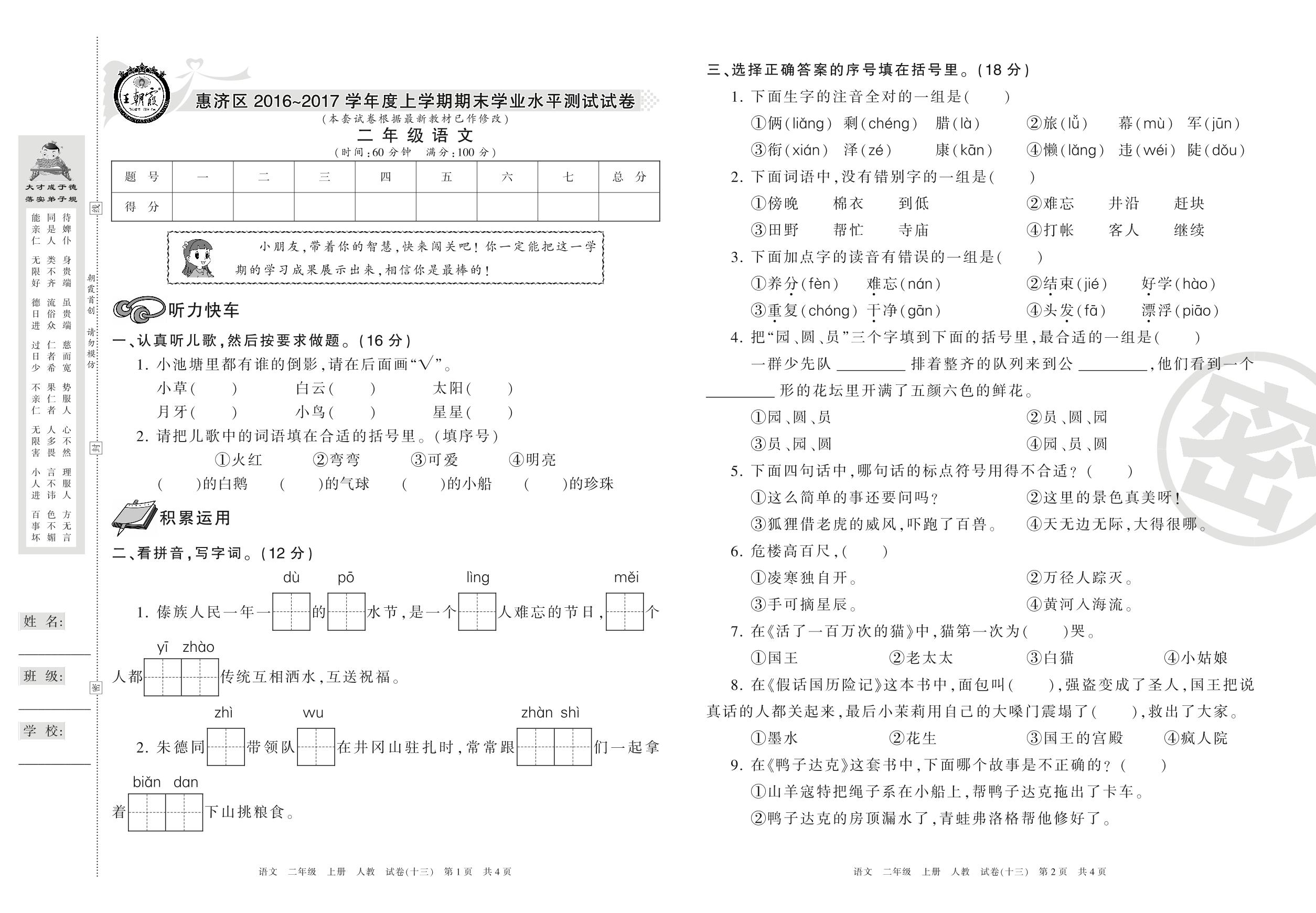 2016-2017学年第一学期郑州市惠济区二年级语文试卷(人教版)【13】