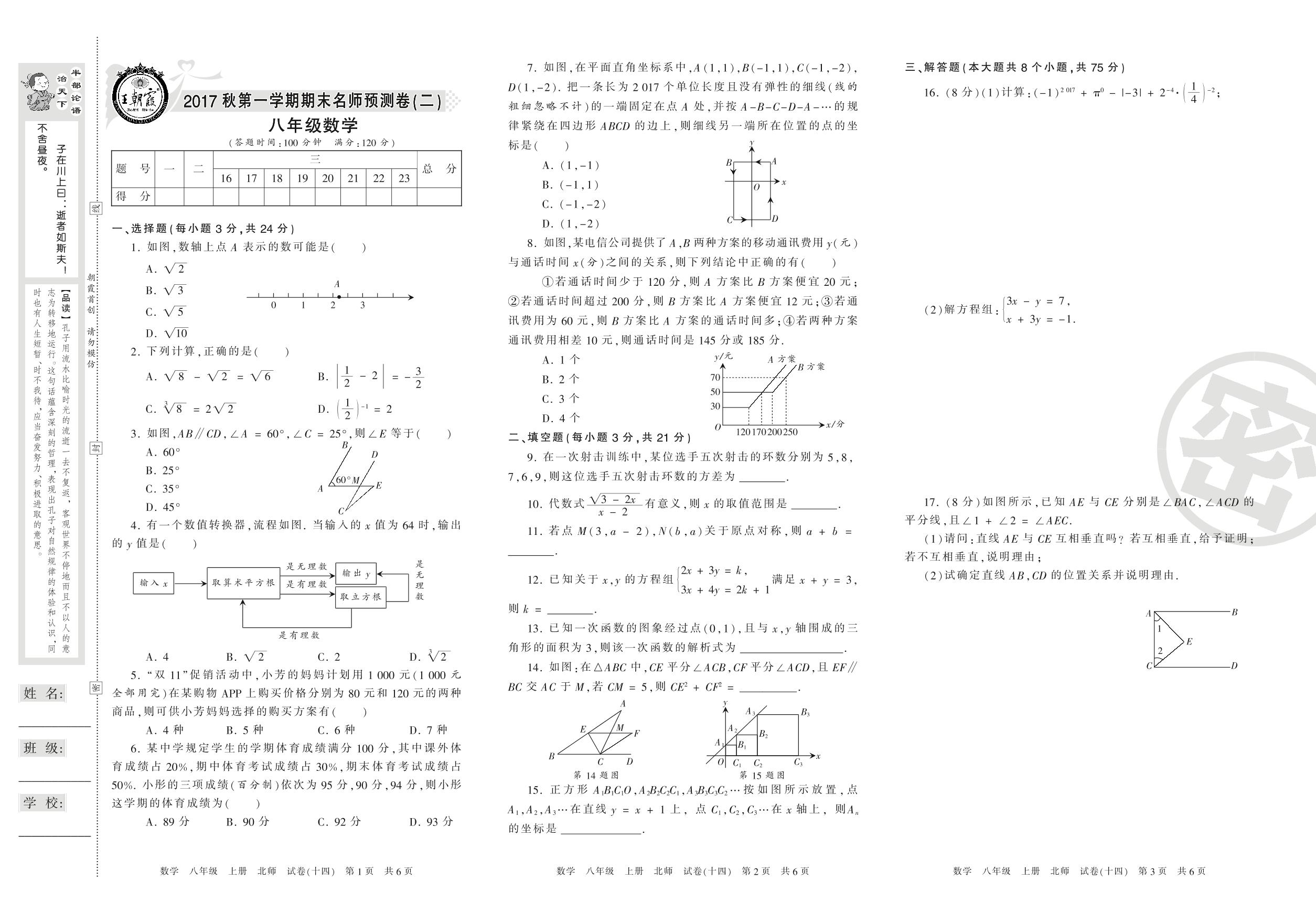 王朝霞名师期末预测卷八年级上册数学(北师版)【14】