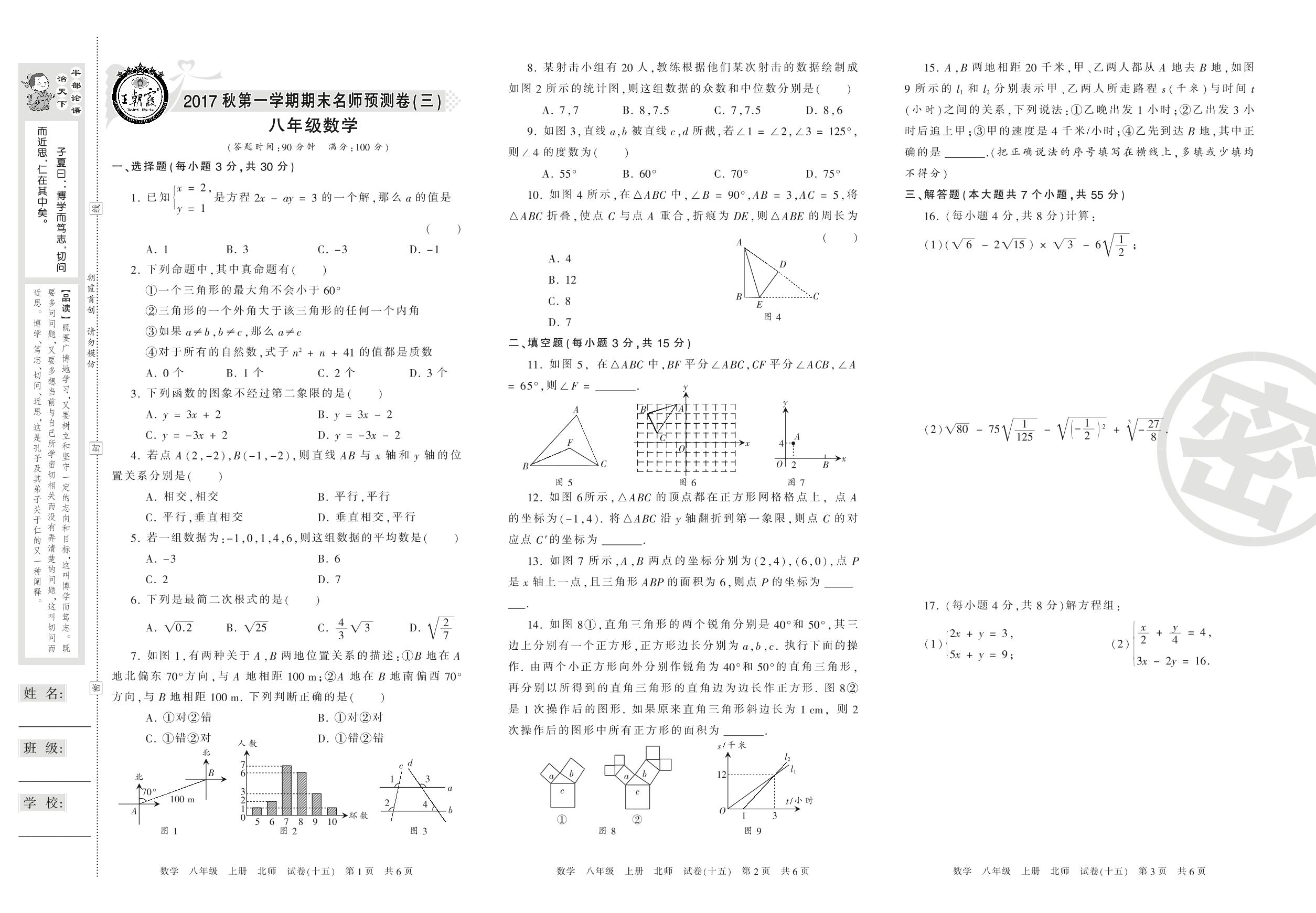 王朝霞名师期末预测卷八年级上册数学(北师版)【15】