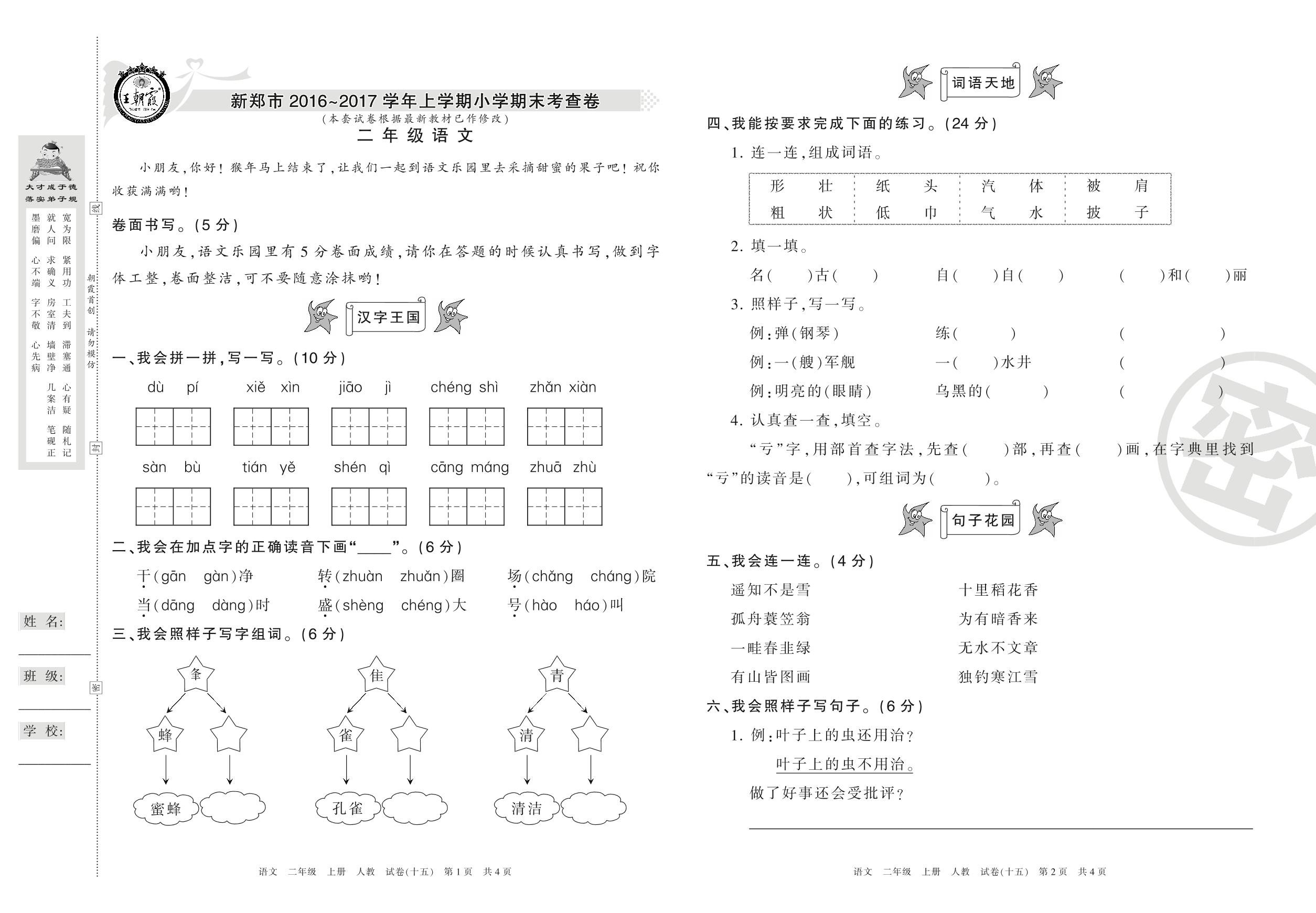 2016-2017学年第一学期新郑市二年级语文试卷(人教版)【15】