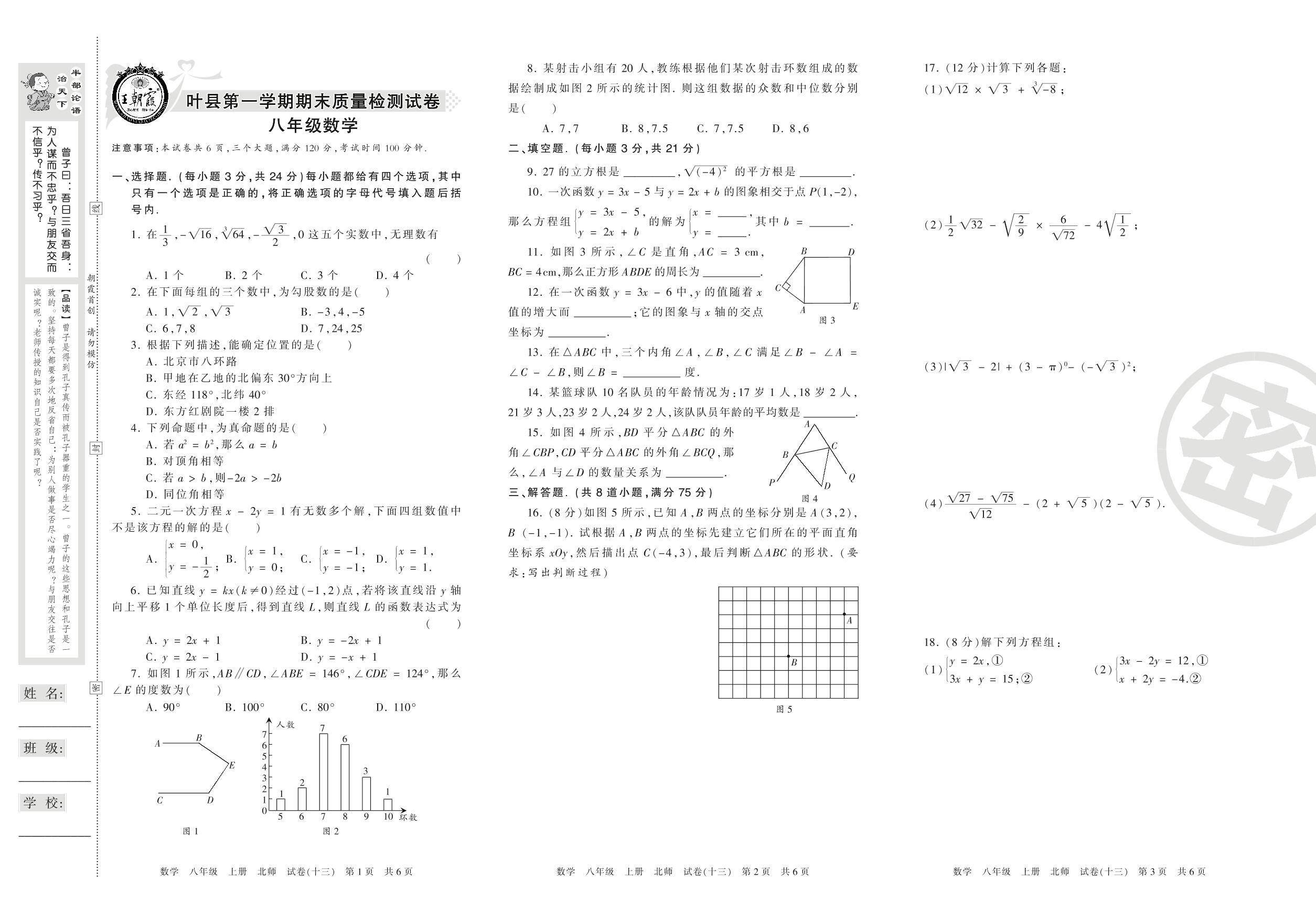 2016-2017学年第一学期平顶山市叶县八年级数学试卷(北师版)【13】
