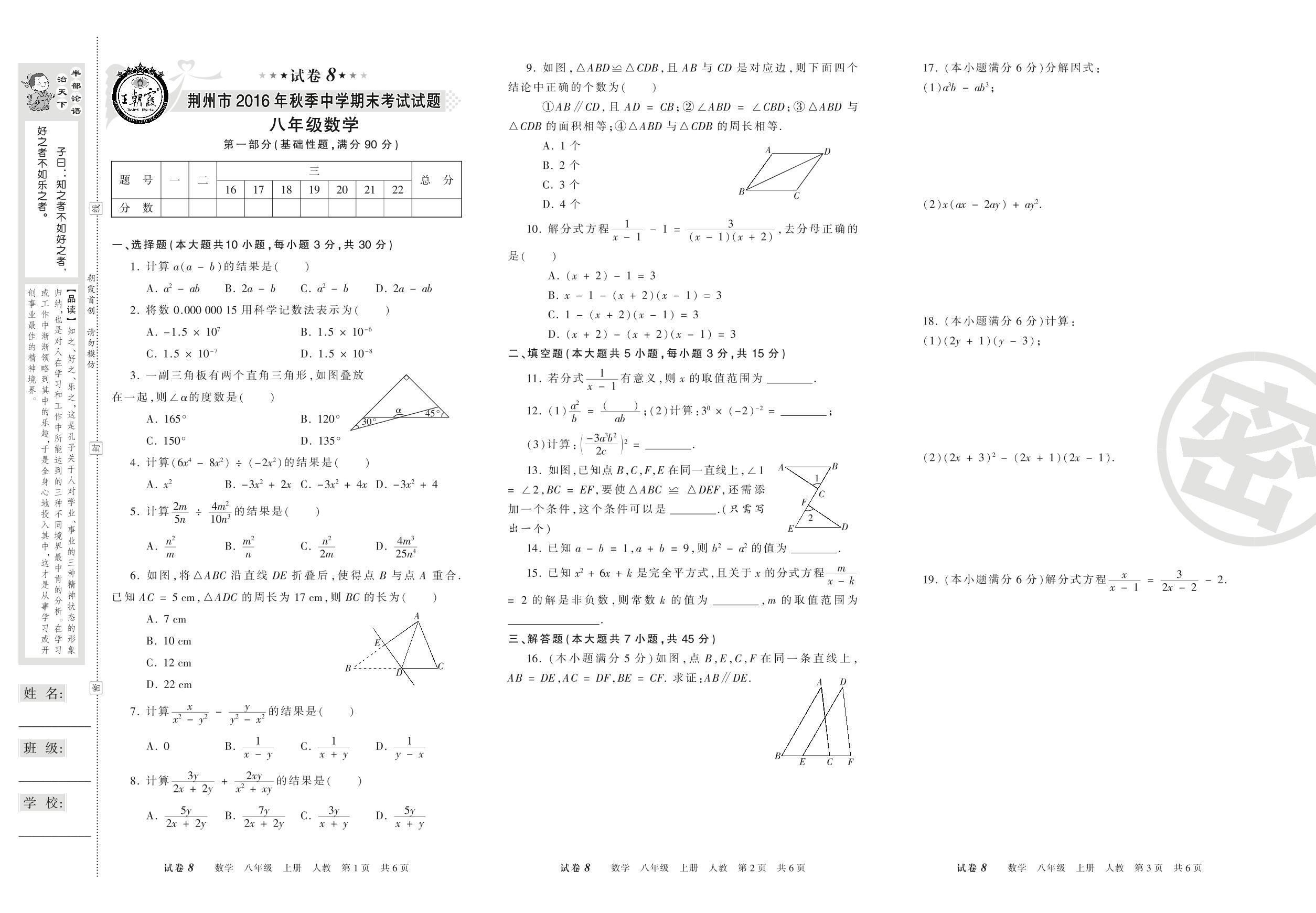 2016-2017学年第一学期荆州市八年级数学试卷(人教版)【8】