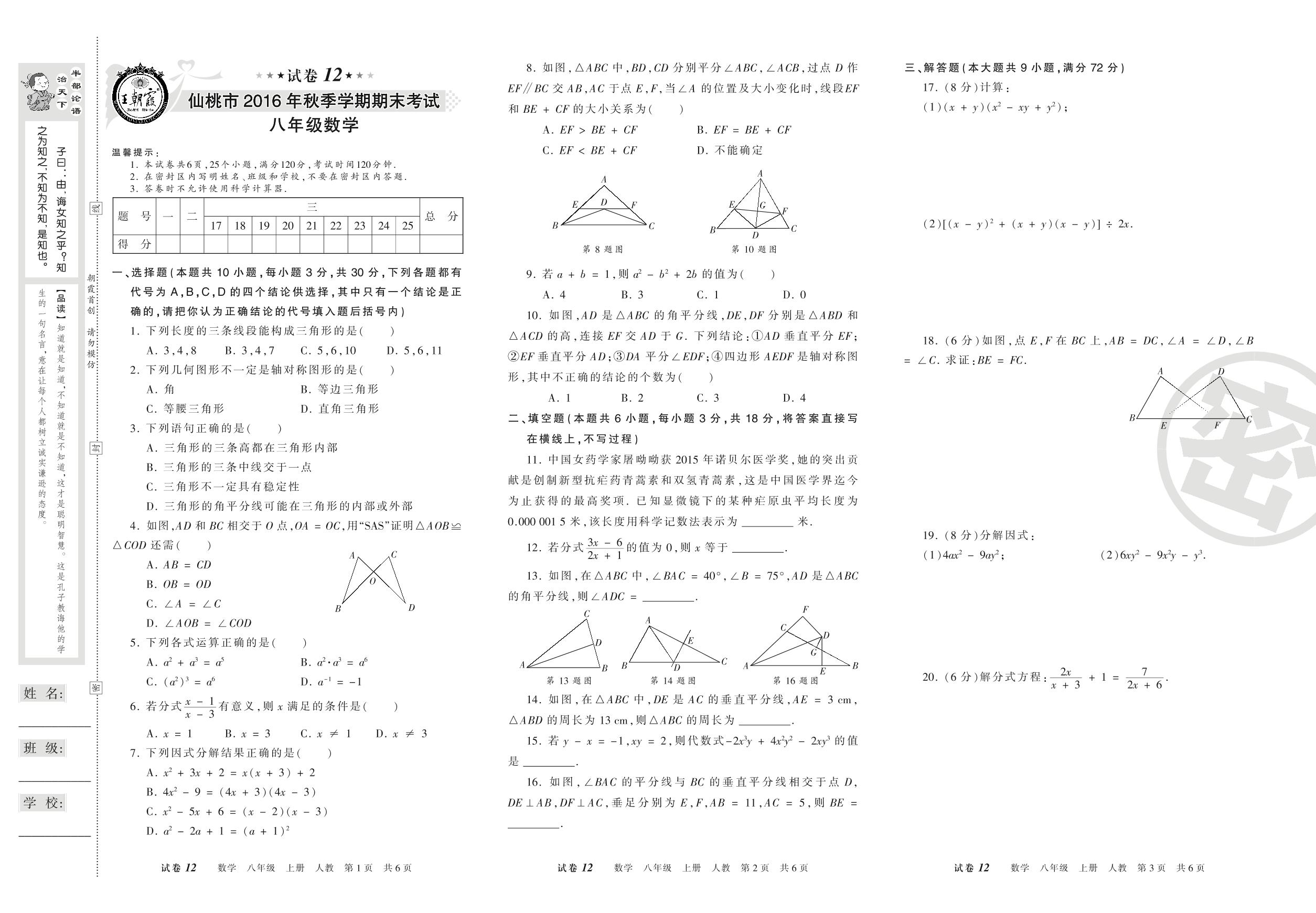 2016-2017学年第一学期仙桃市八年级数学试卷(人教版)【12】