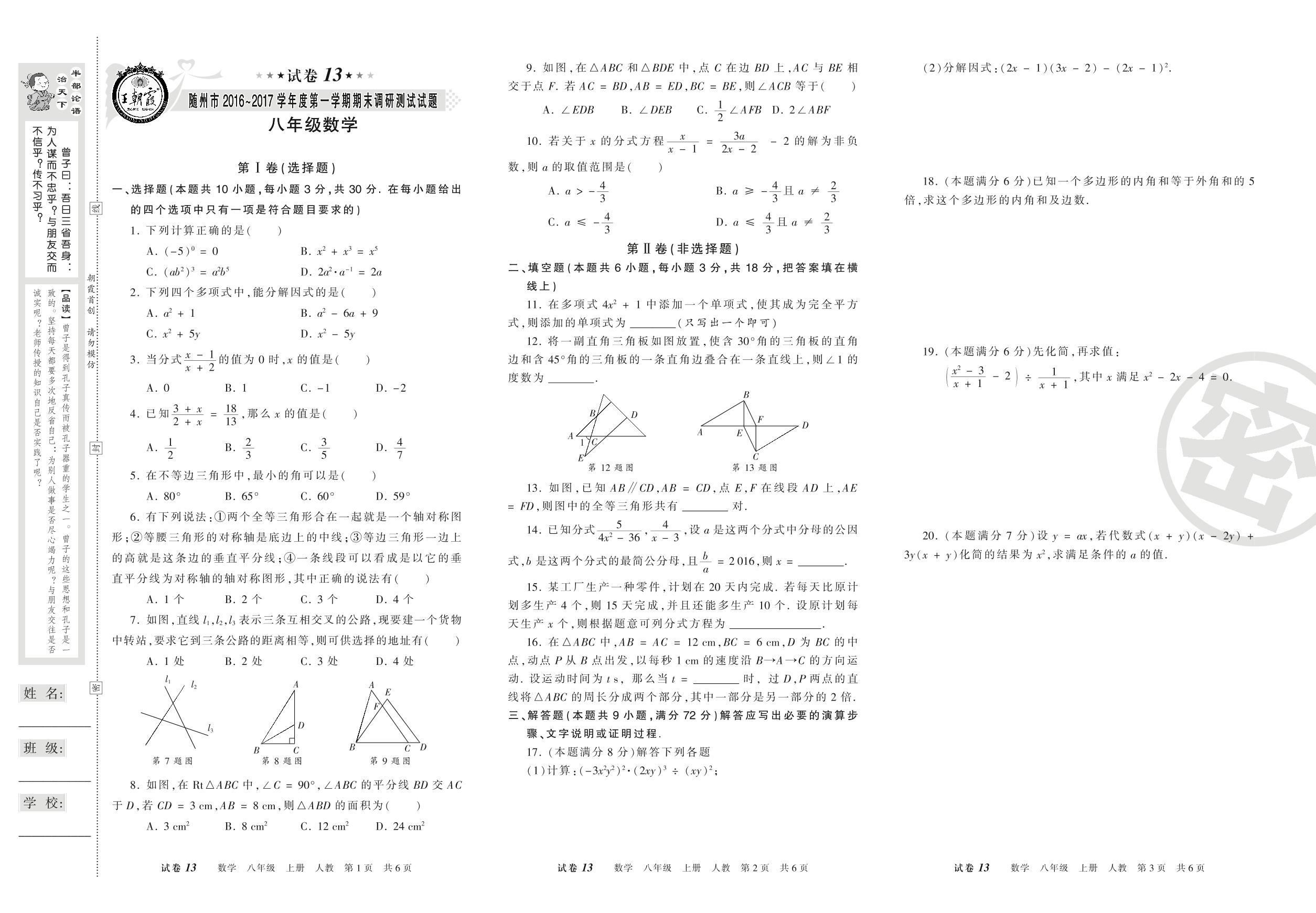 2016-2017学年第一学期随州市八年级数学试卷(人教版)【13】