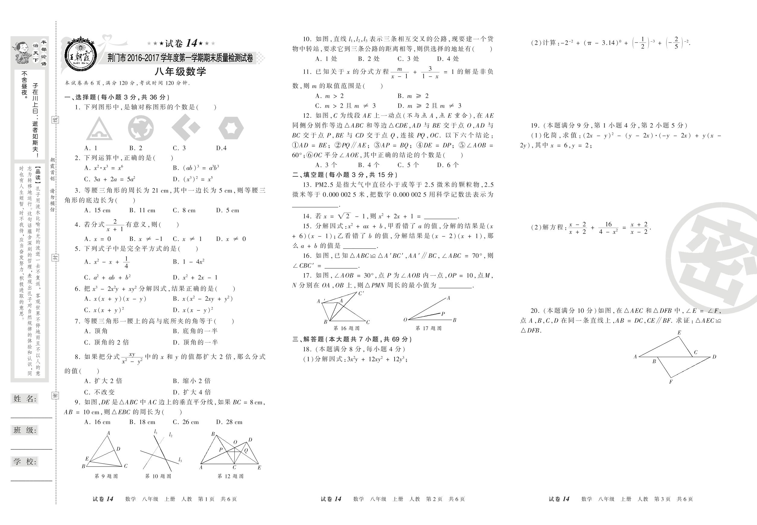 2016-2017学年第一学期荆门市八年级数学试卷(人教版)【14】