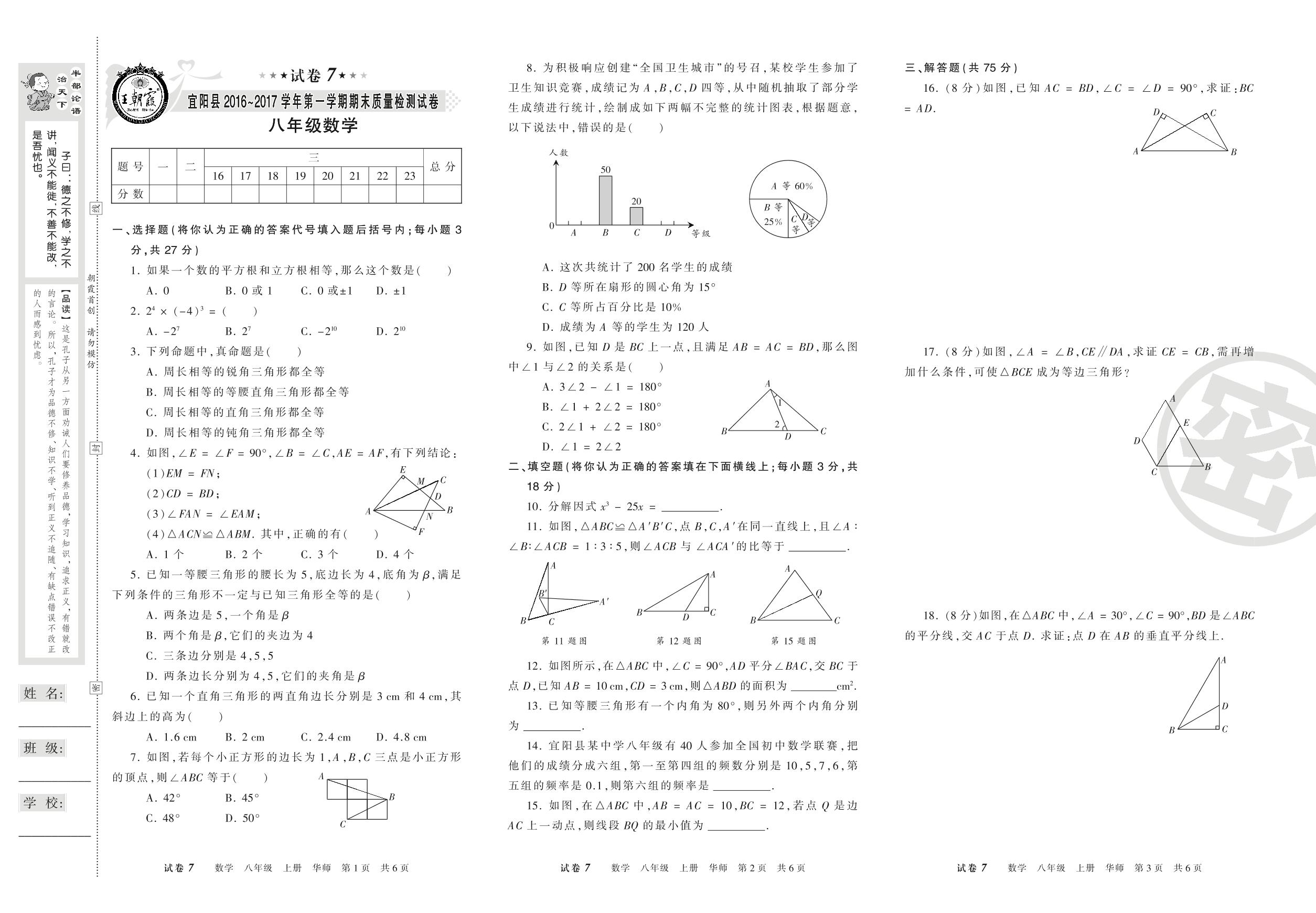 2016-2017学年第一学期洛阳市宜阳县八年级数学试卷(华师版)【7】