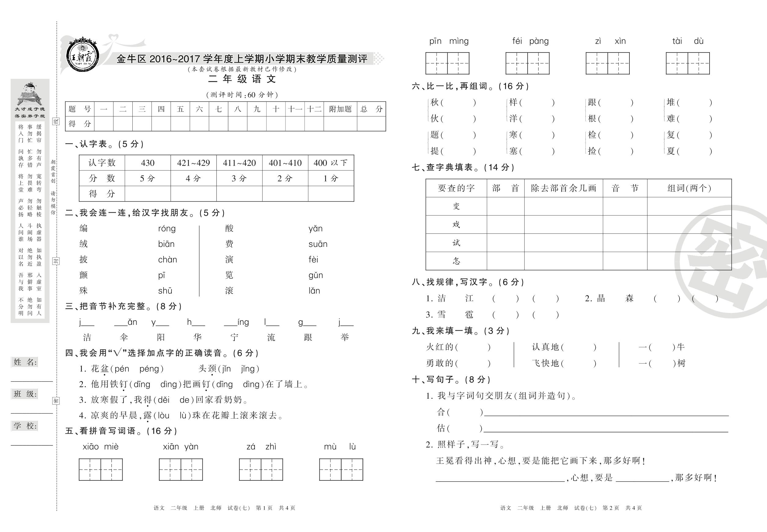 2016-2017学年第一学期成都市金牛区二年级语文试卷(北师版)【7】