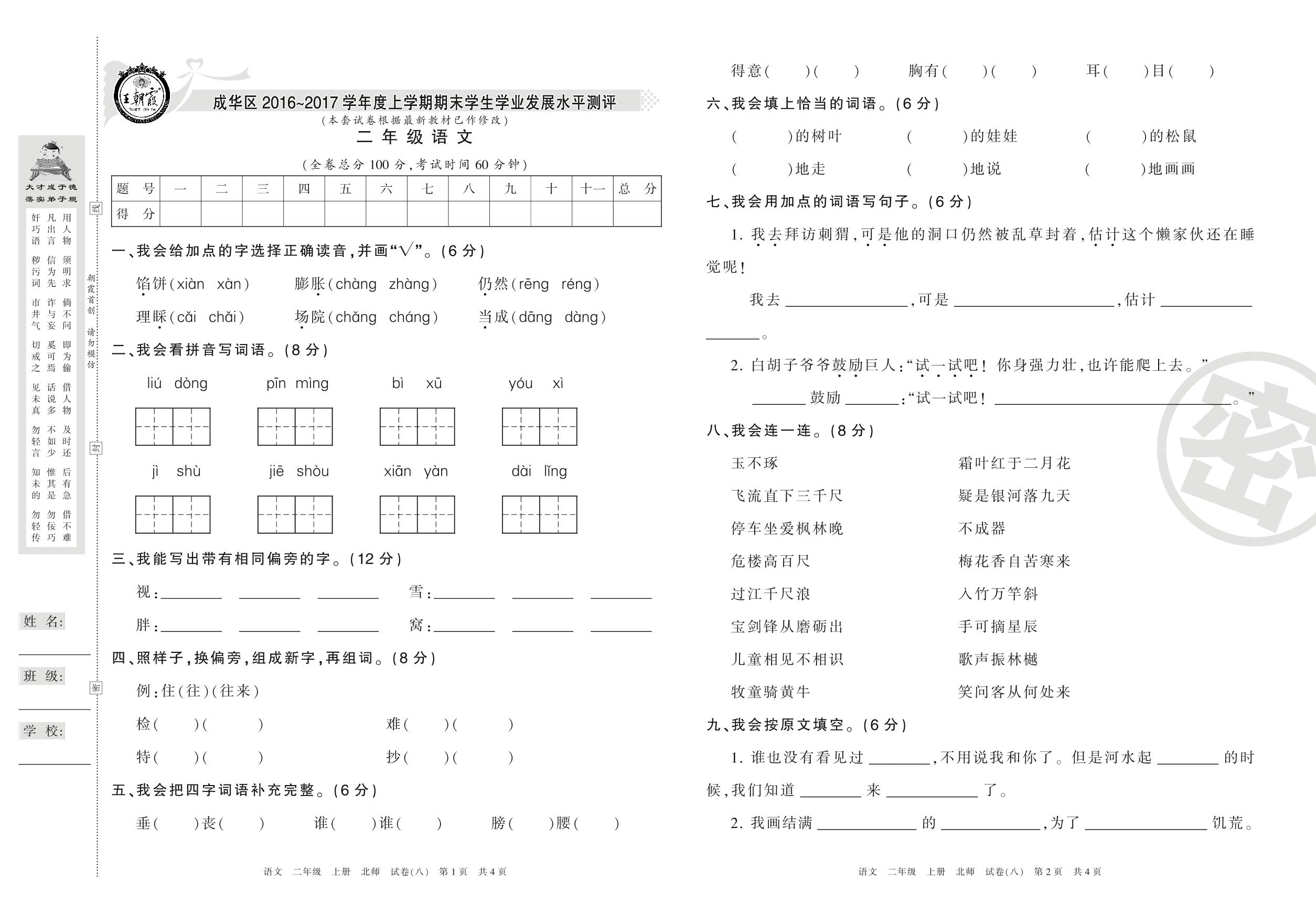 2016-2017学年第一学期成都市成华区二年级语文试卷(北师版)【8】