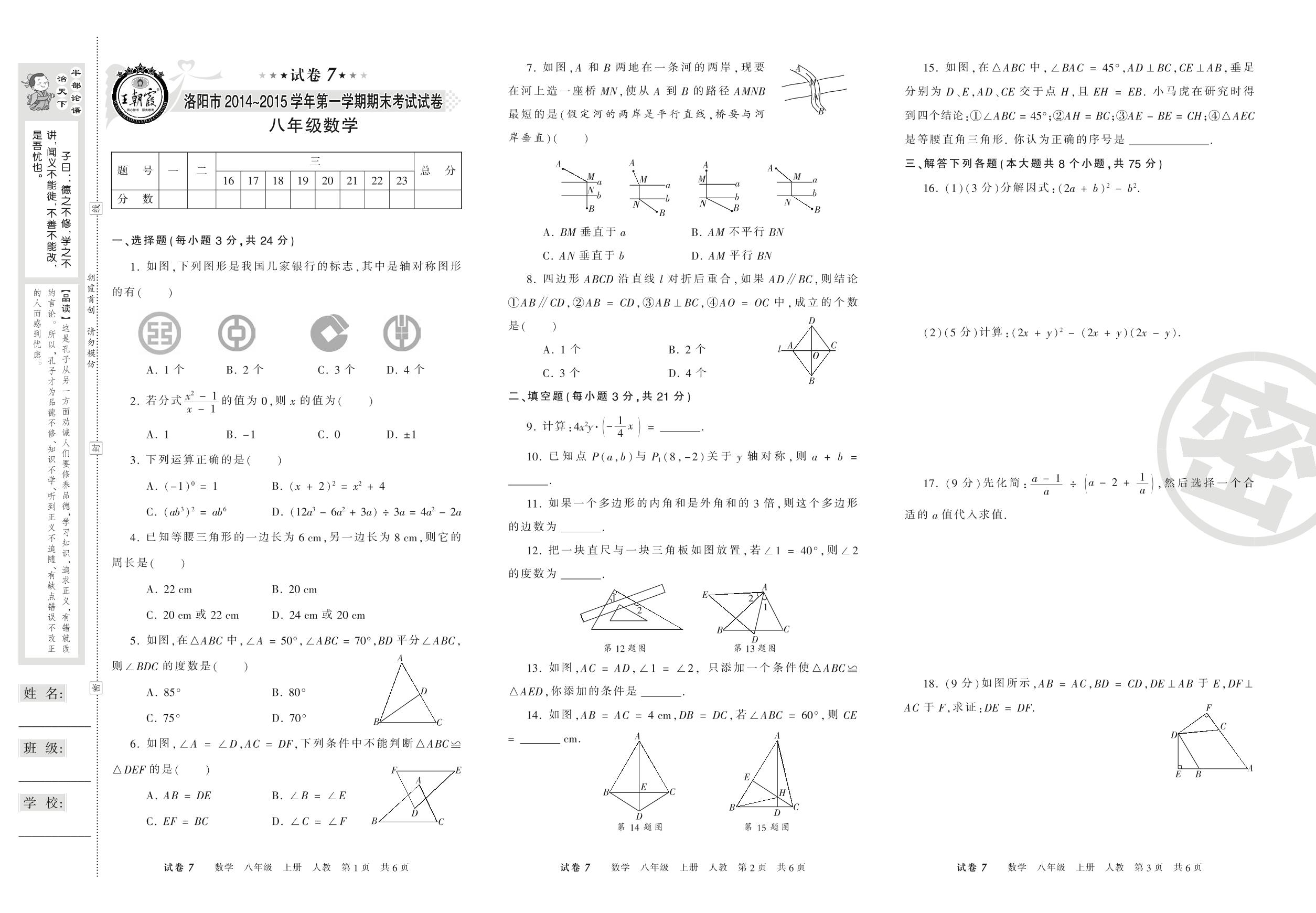 2014-2015学年第一学期洛阳市八年级数学试卷(人教版)【7】