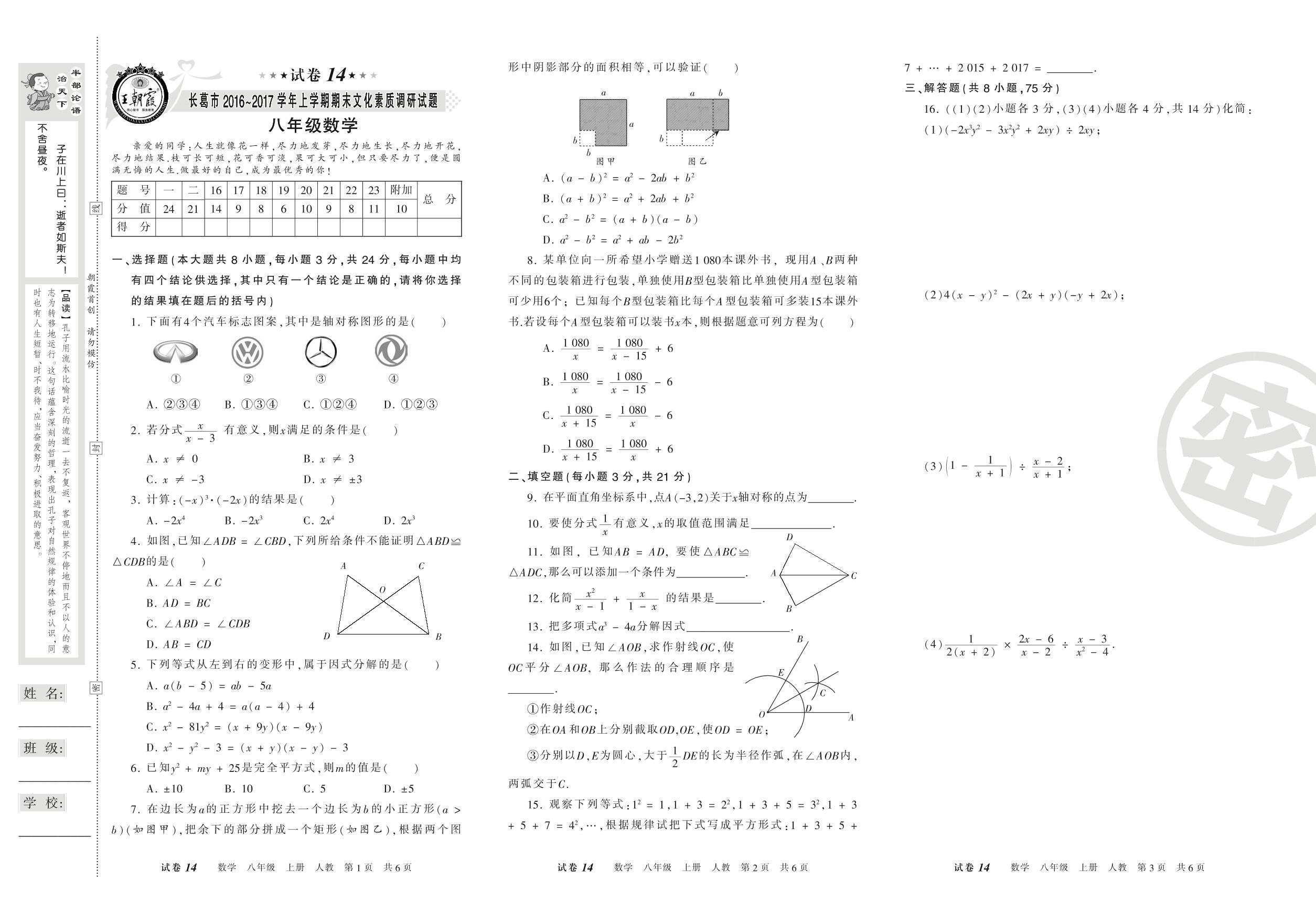 2016-2017学年第一学期长葛市八年级数学试卷(人教版)【14】