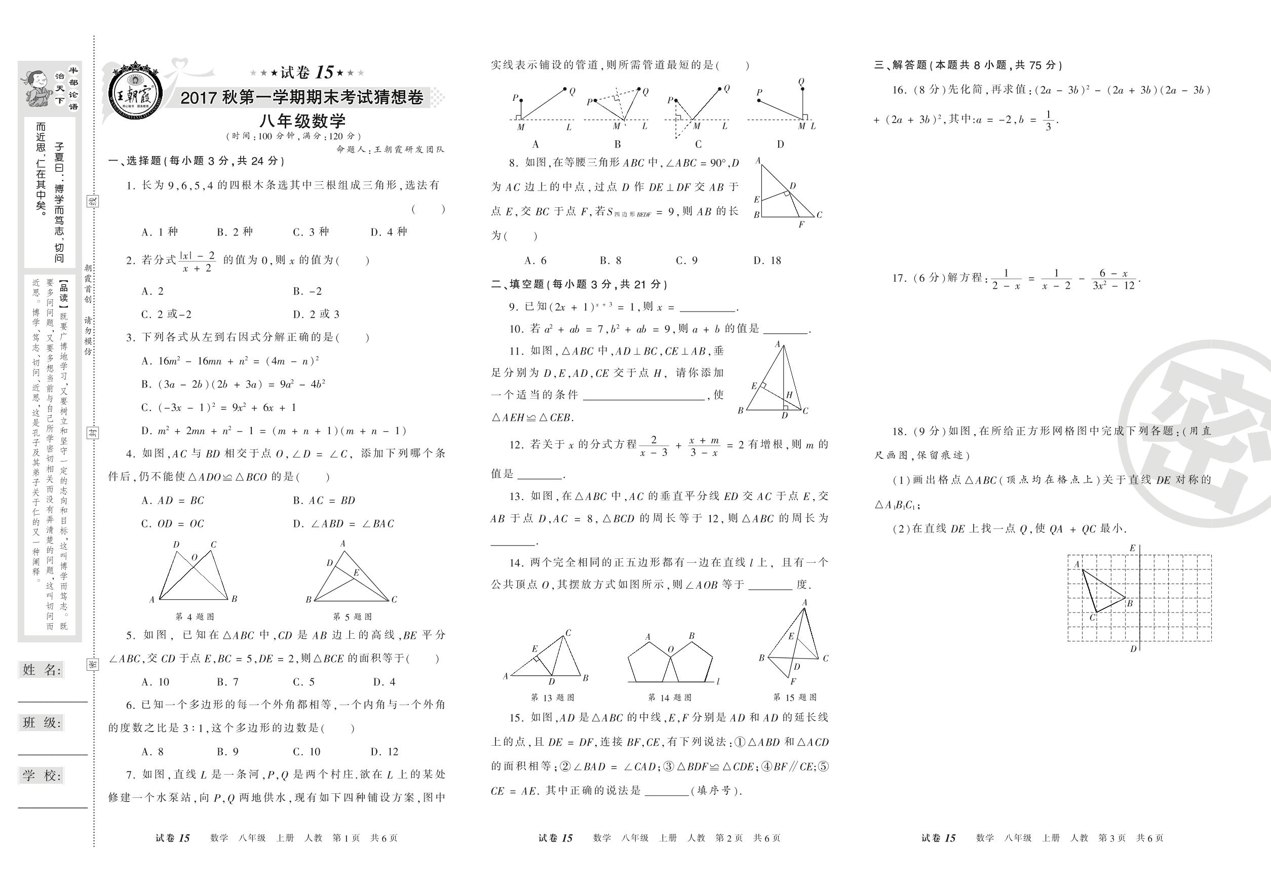 王朝霞期末猜想卷八年级上册数学(人教版)【15】