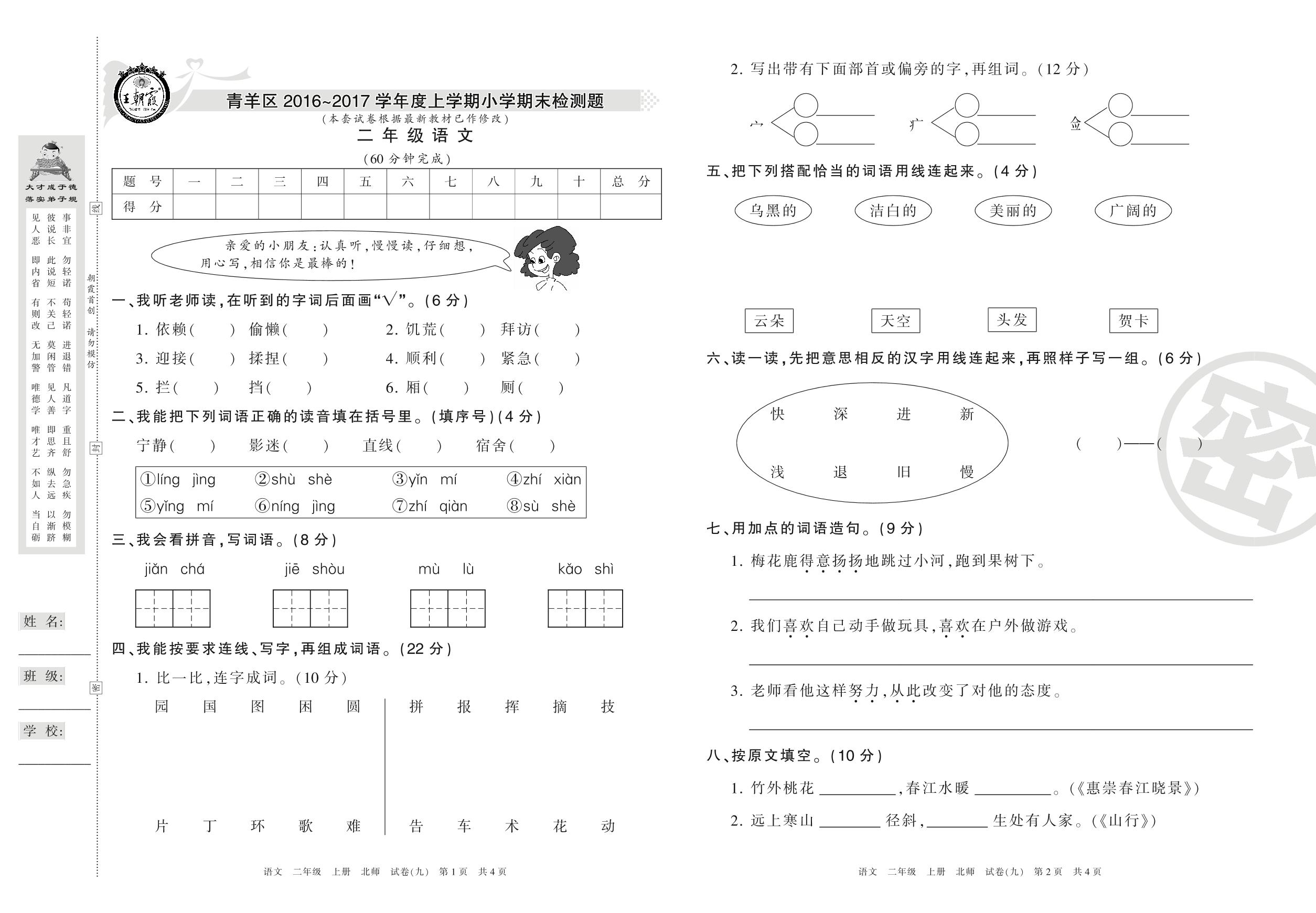 2016-2017学年第一学期成都市青羊区二年级语文试卷(北师版)【9】