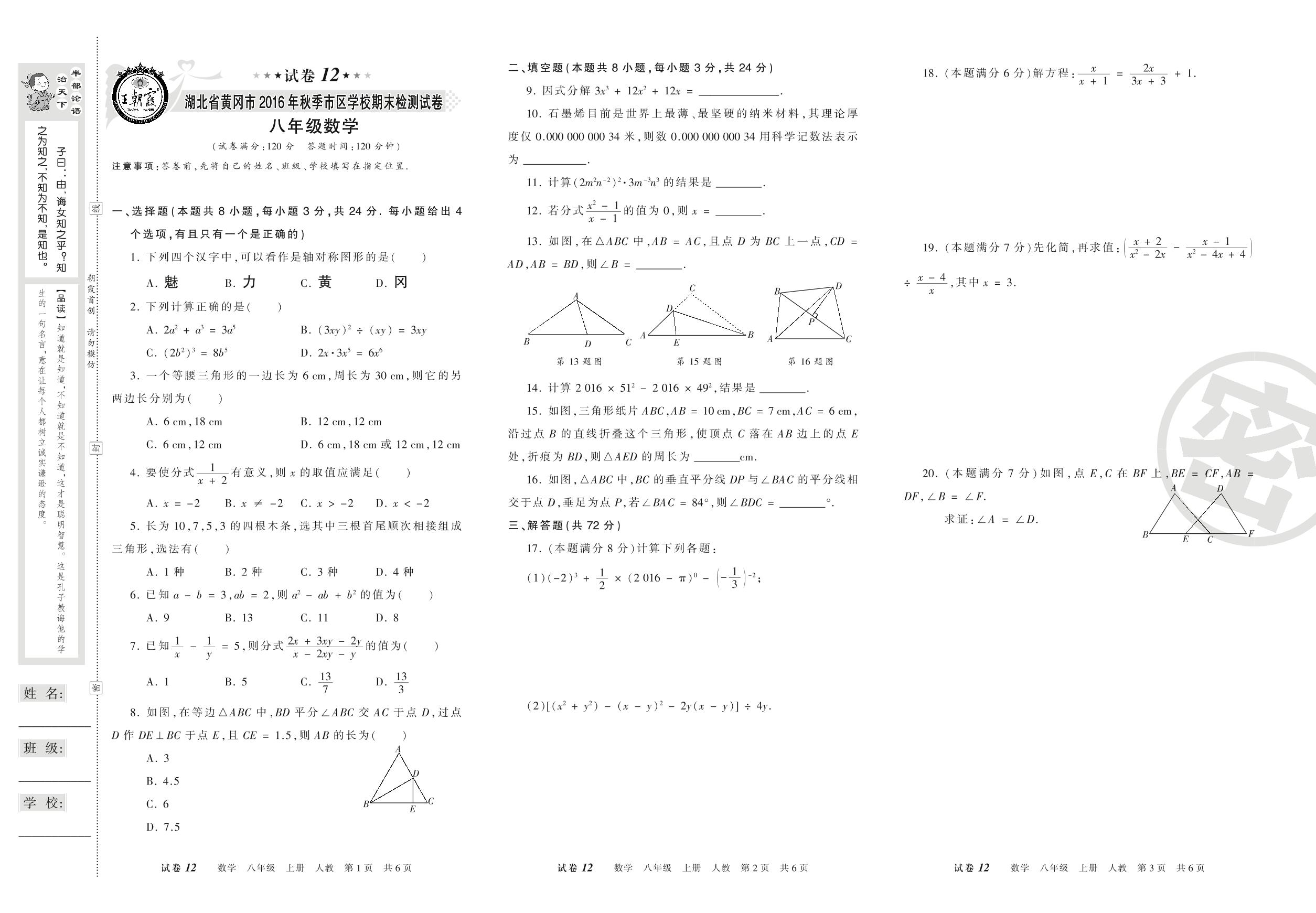 2016-2017学年第一学期湖北省黄冈市八年级数学试卷(人教版)【12】