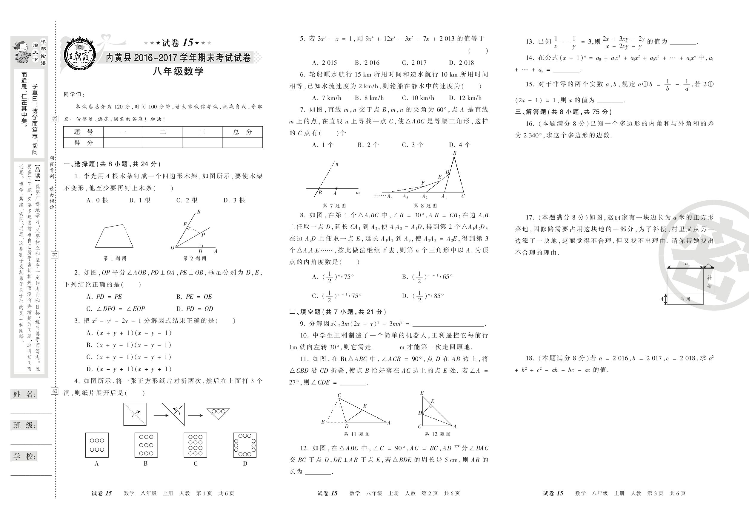 2016-2017学年第一学期安阳市内黄县八年级数学试卷(人教版)【15】