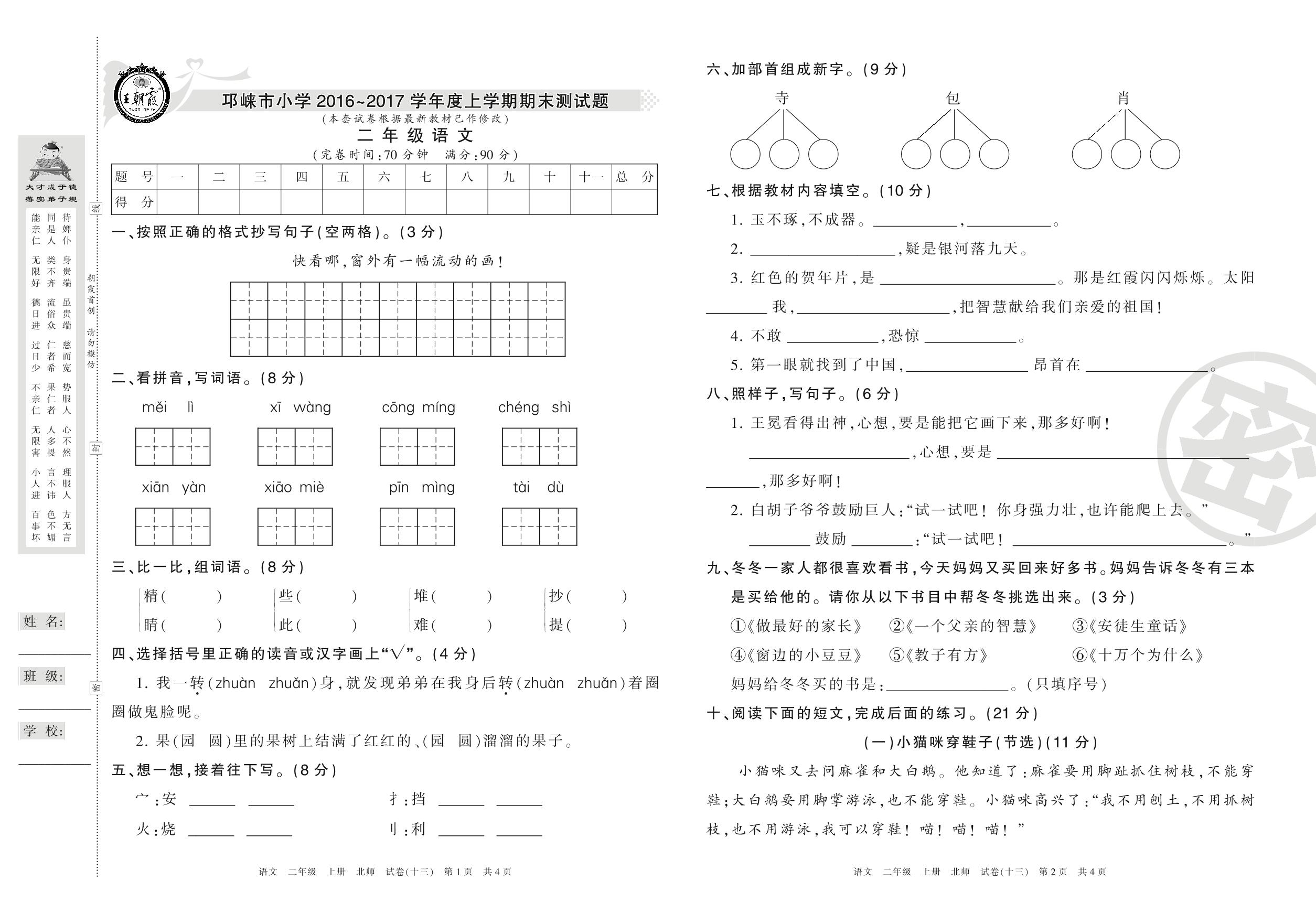 2016-2017学年第一学期邛崃市二年级语文试卷(北师版)【13】