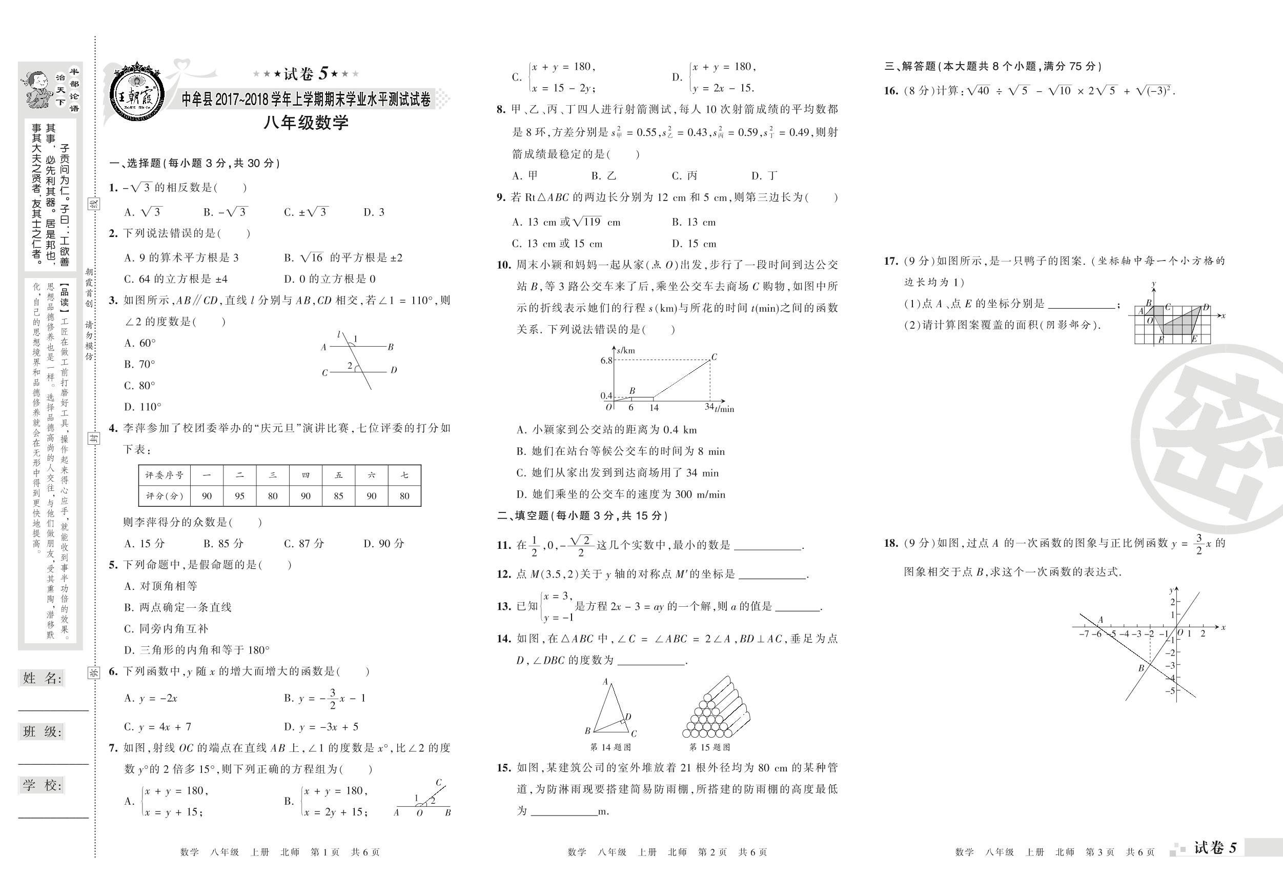 2017-2018学年第一学期郑州市中牟县八年级数学试卷(北师版)【5】