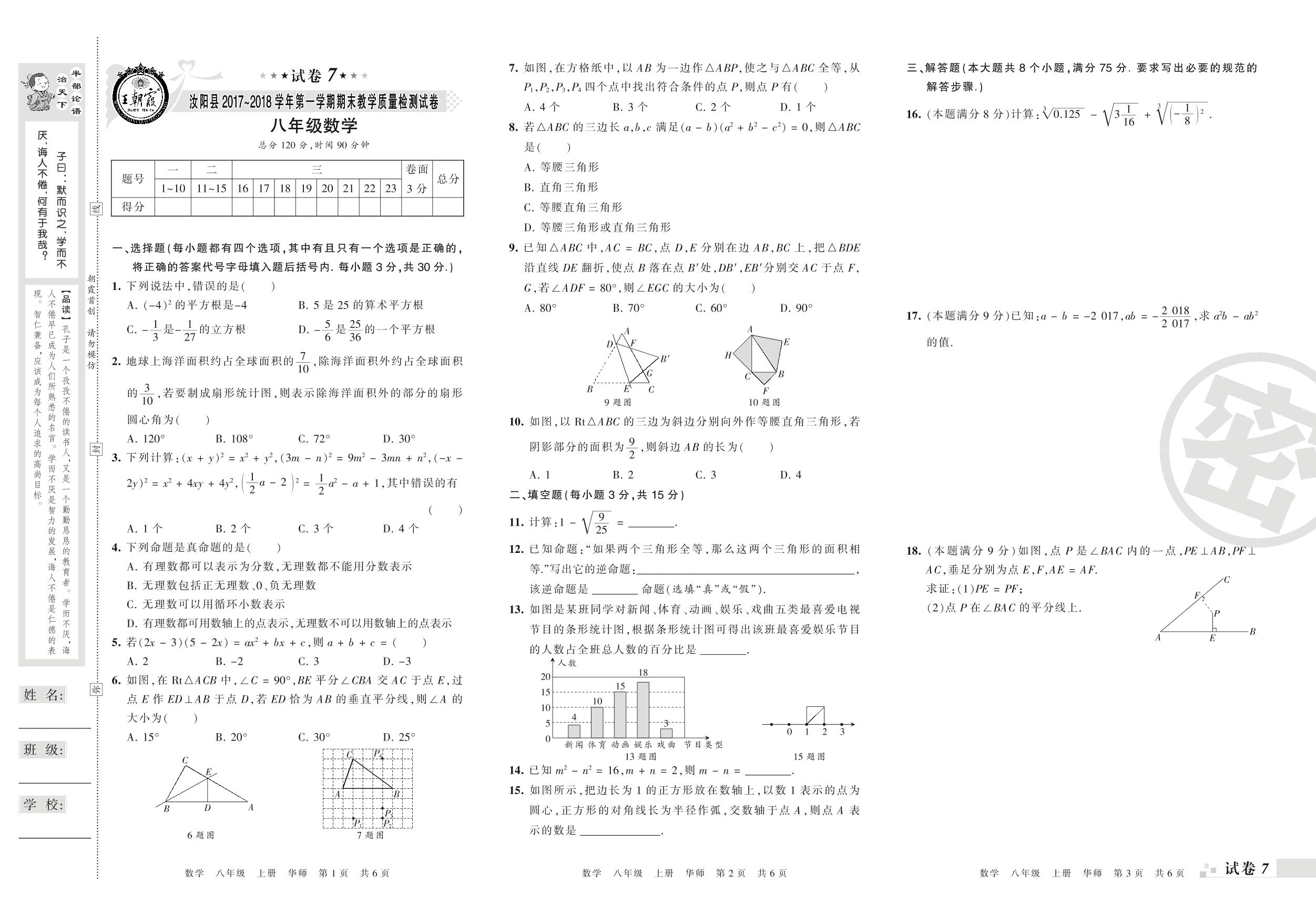 2017-2018学年第一学期洛阳市汝阳县八年级数学试卷(华师版)【7】