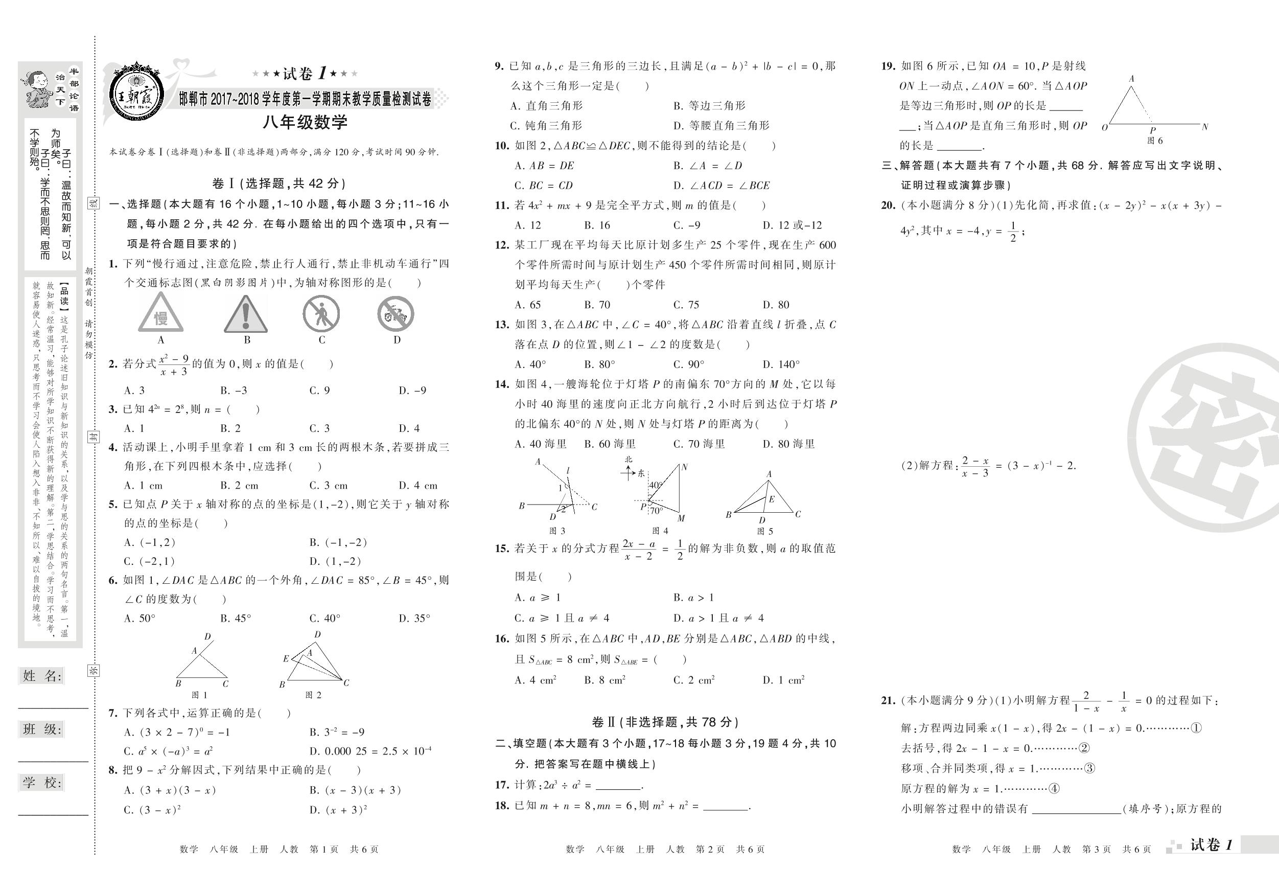 2017-2018学年第一学期邯郸市八年级数学试卷(人教版)【1】
