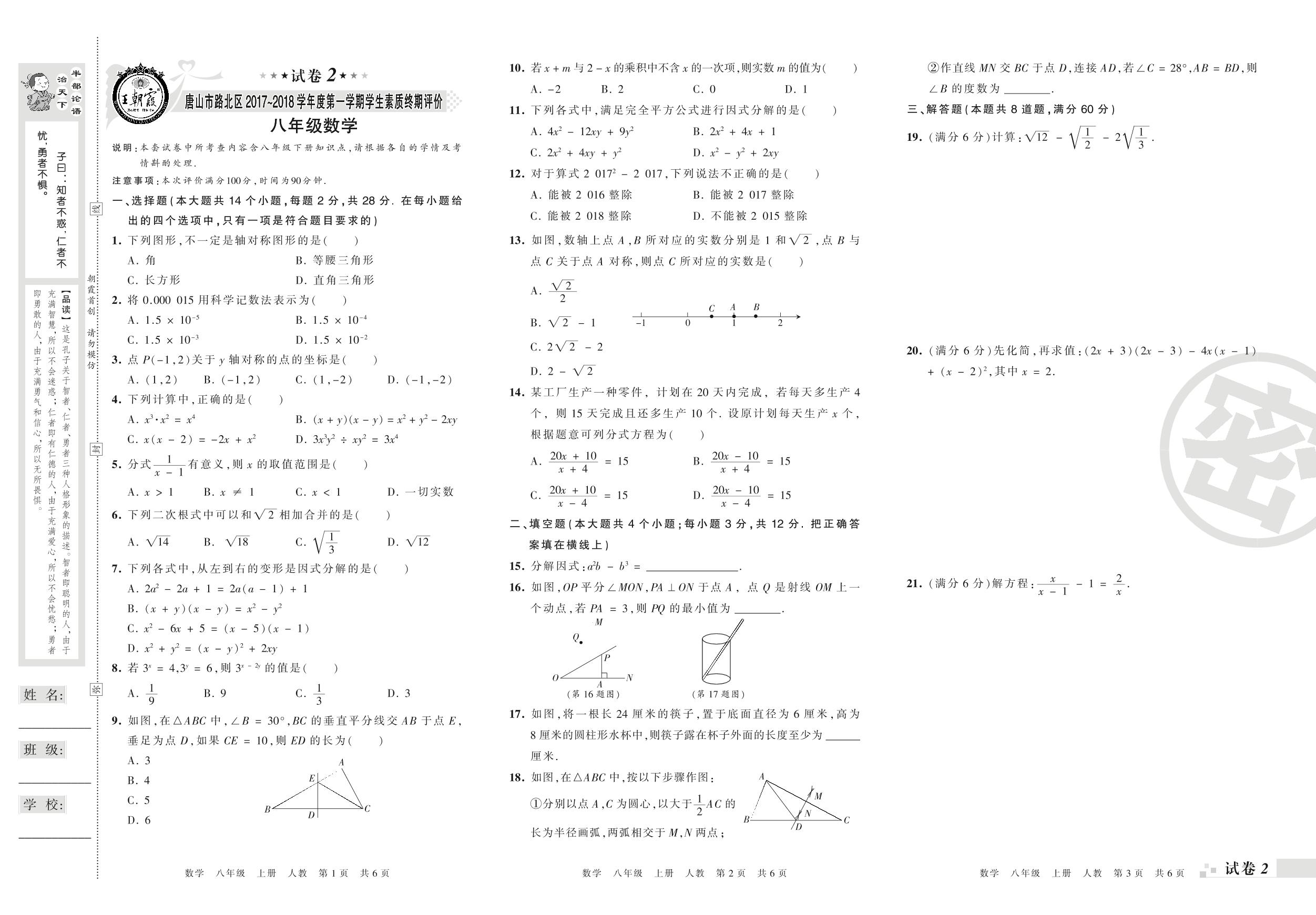 2017-2018学年第一学期唐山市路北区八年级数学试卷(人教版)【2】