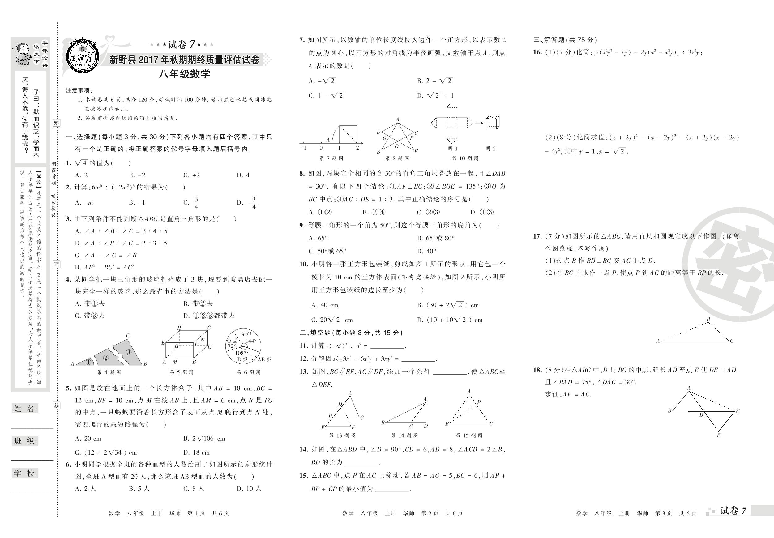 2017-2018学年第一学期南阳市新野县八年级数学试卷(华师版)【7】