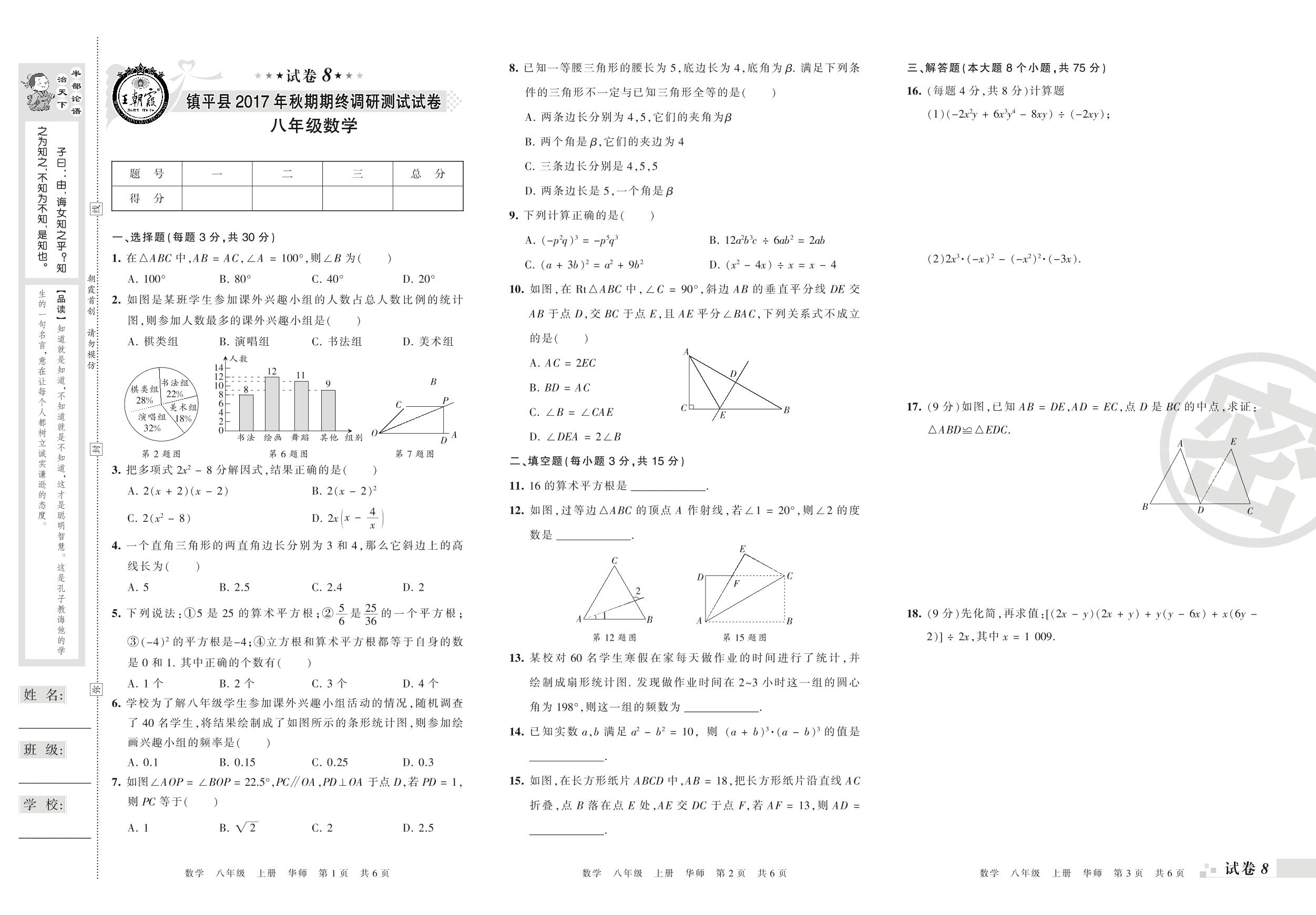 2017-2018学年第一学期南阳市镇平县八年级数学试卷(华师版)【8】