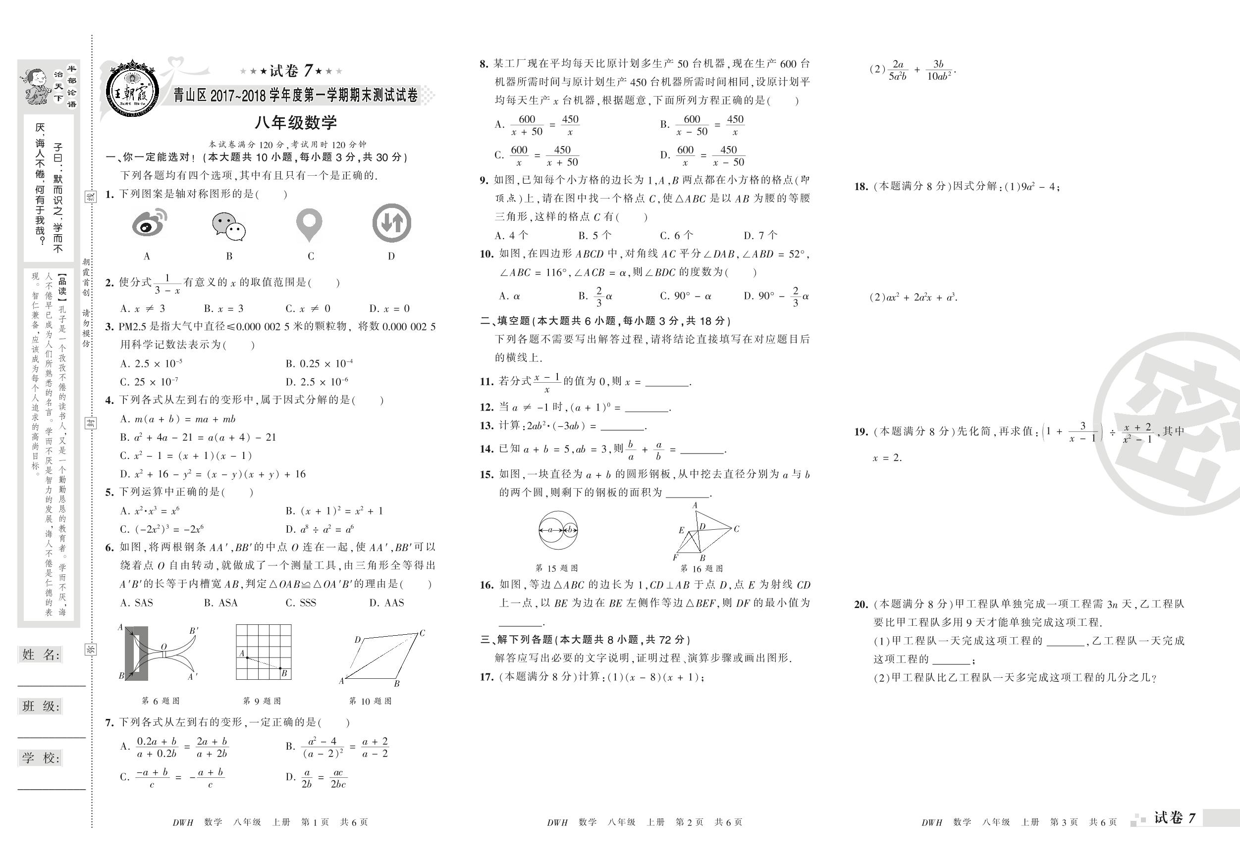 2017-2018学年第一学期武汉市青山区八年级数学试卷(人教版)【7】
