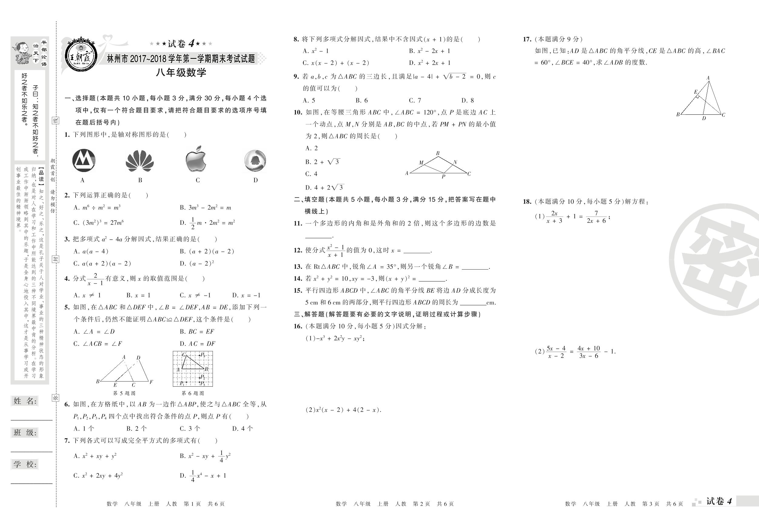 2017-2018学年第一学期林州市八年级数学试卷(人教版)【4】