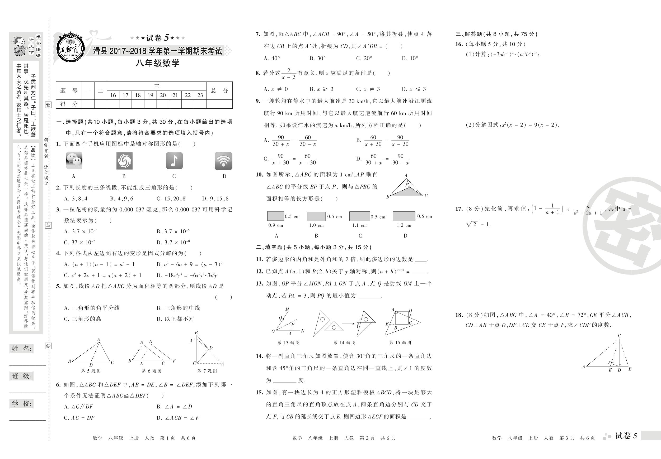2017-2018学年第一学期安阳市滑县八年级数学试卷(人教版)【5】