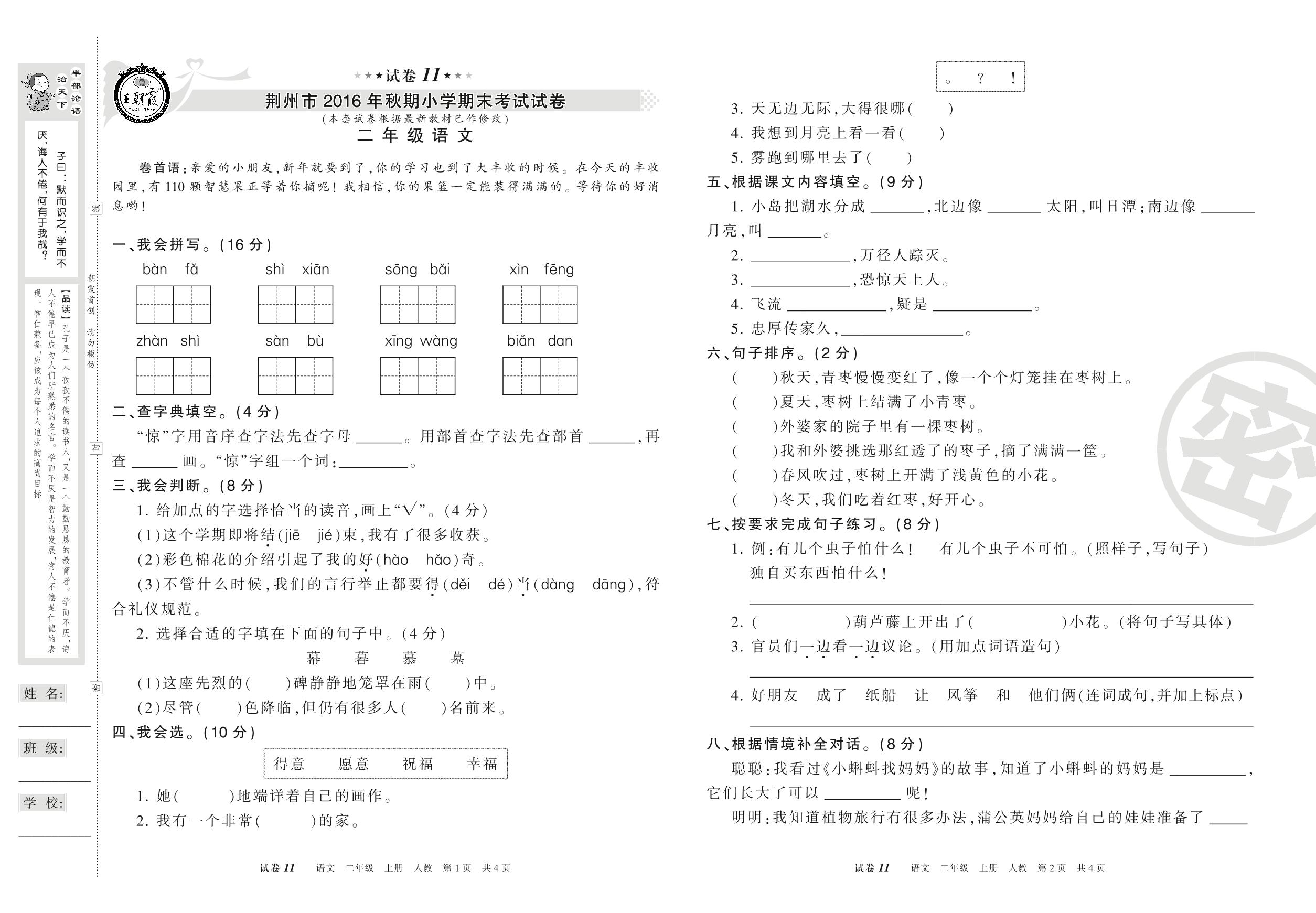 2016-2017学年第一学期荆州市二年级语文试卷(人教版)【11】