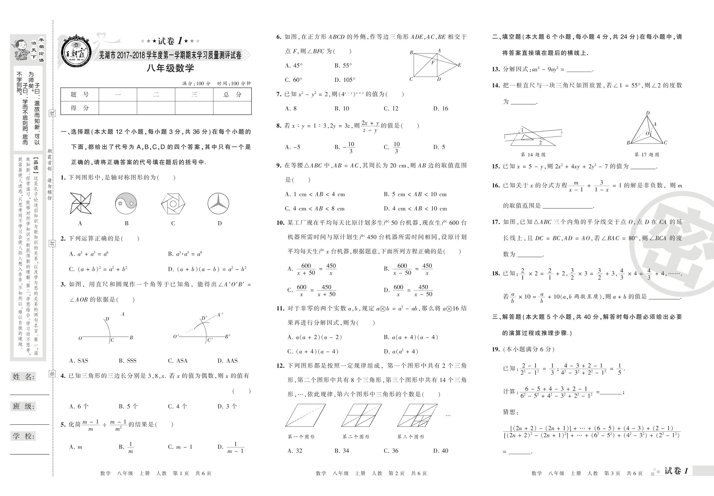 2017-2018学年第一学期芜湖市八年级数学试卷(人教版)【1】