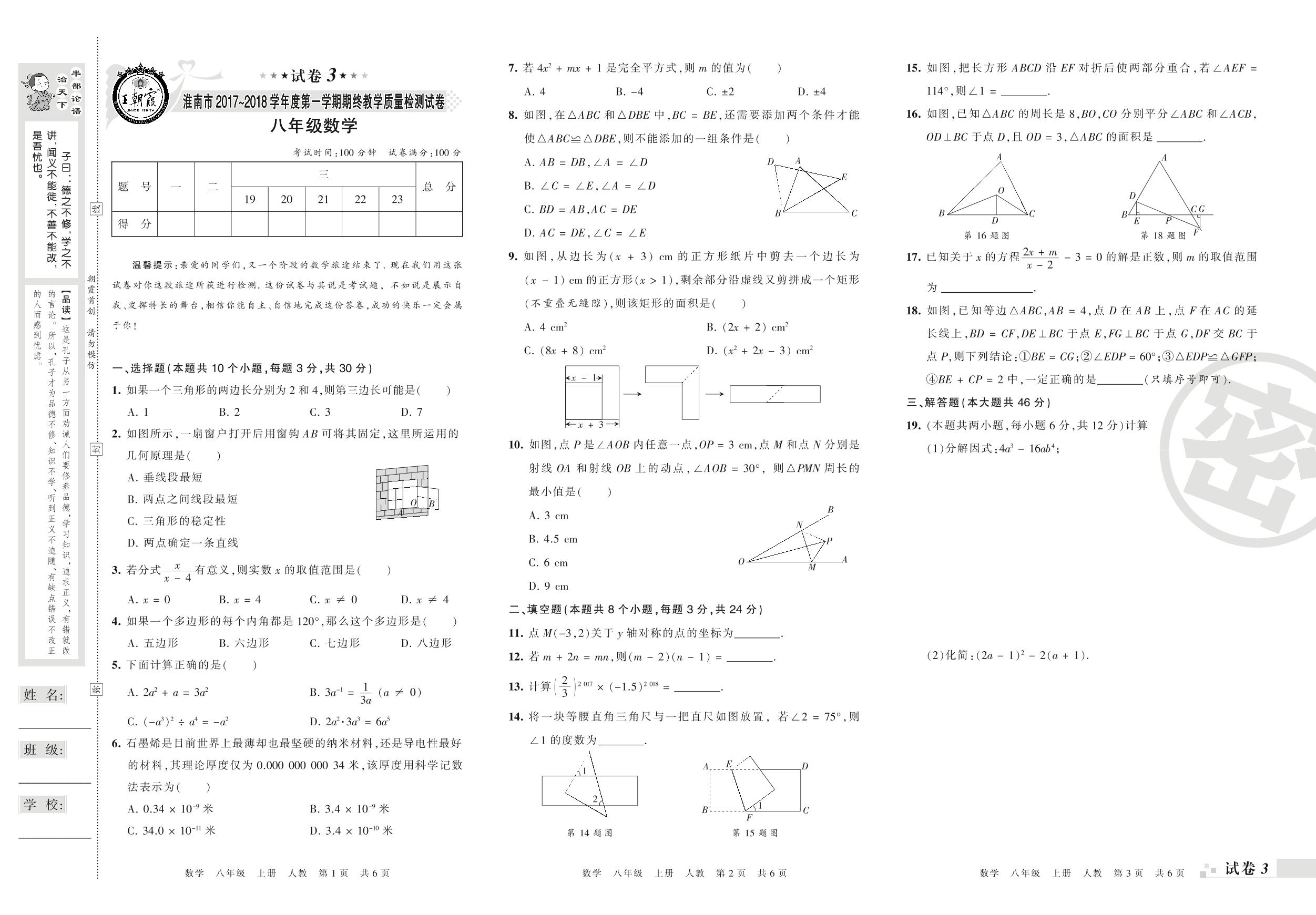 2017-2018学年第一学期淮南市八年级数学试卷(人教版)【3】