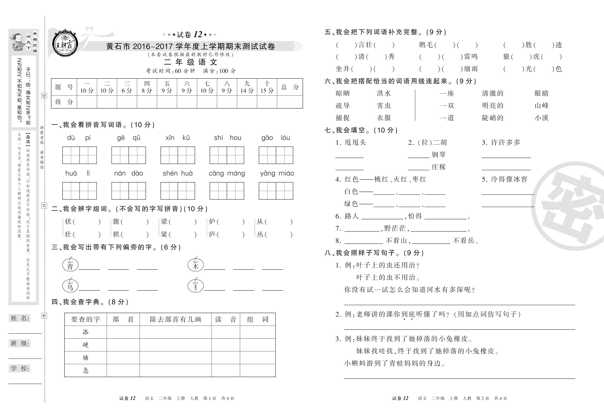 2016-2017学年第一学期黄石市二年级语文试卷(人教版)【12】