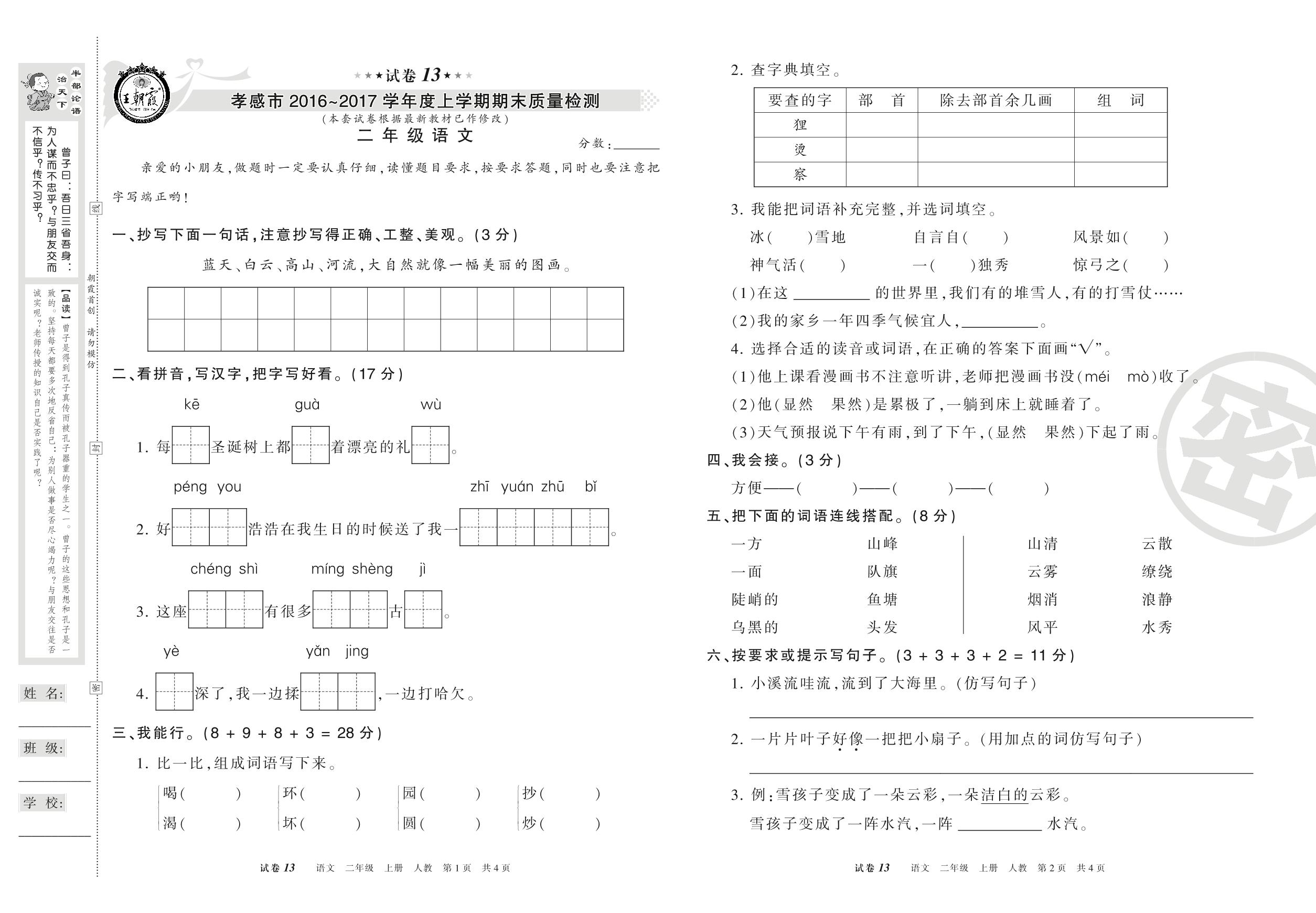 2016-2017学年第一学期孝感市二年级语文试卷(人教版)【13】