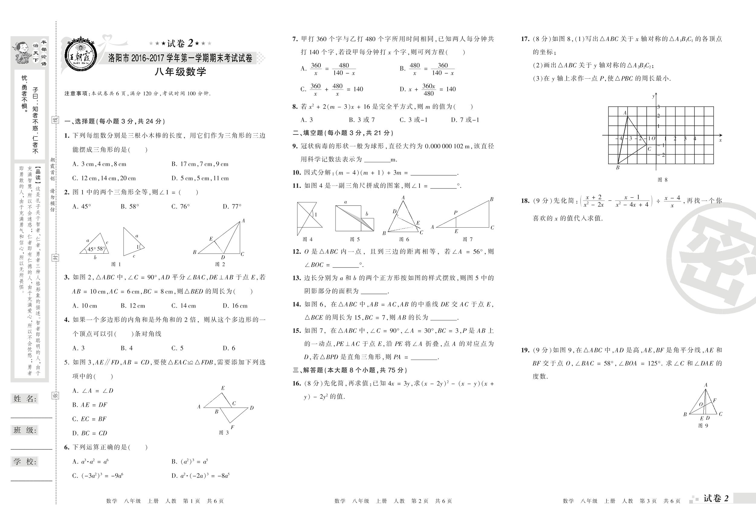 2016-2017学年第一学期洛阳市八年级数学试卷(人教版)【2】