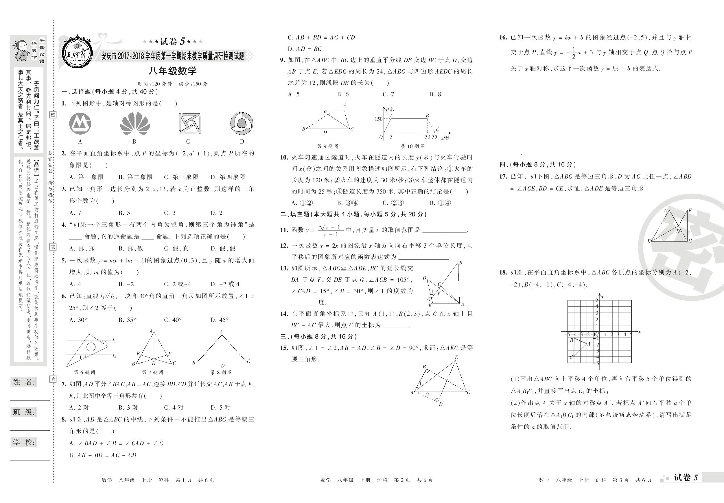2017-2018学年第一学期安庆市八年级数学试卷(沪科版)【5】