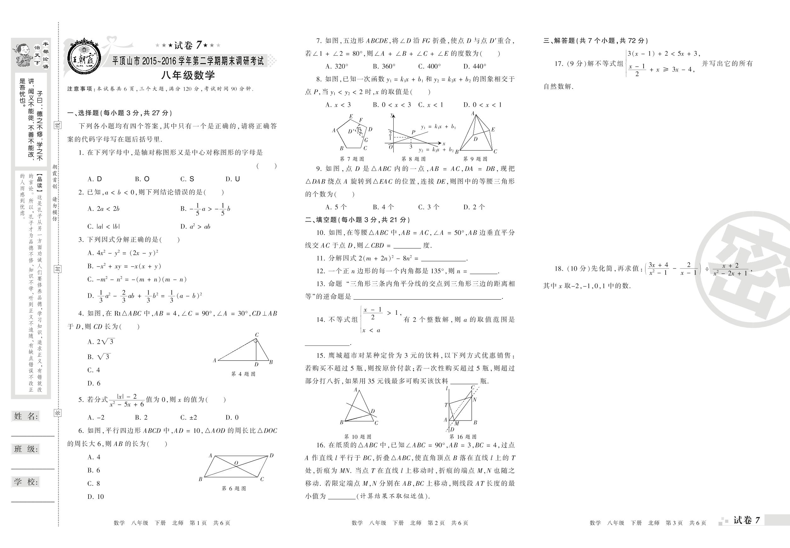 2015-2016学年第二学期平顶山市八年级数学试卷(北师版)【7】