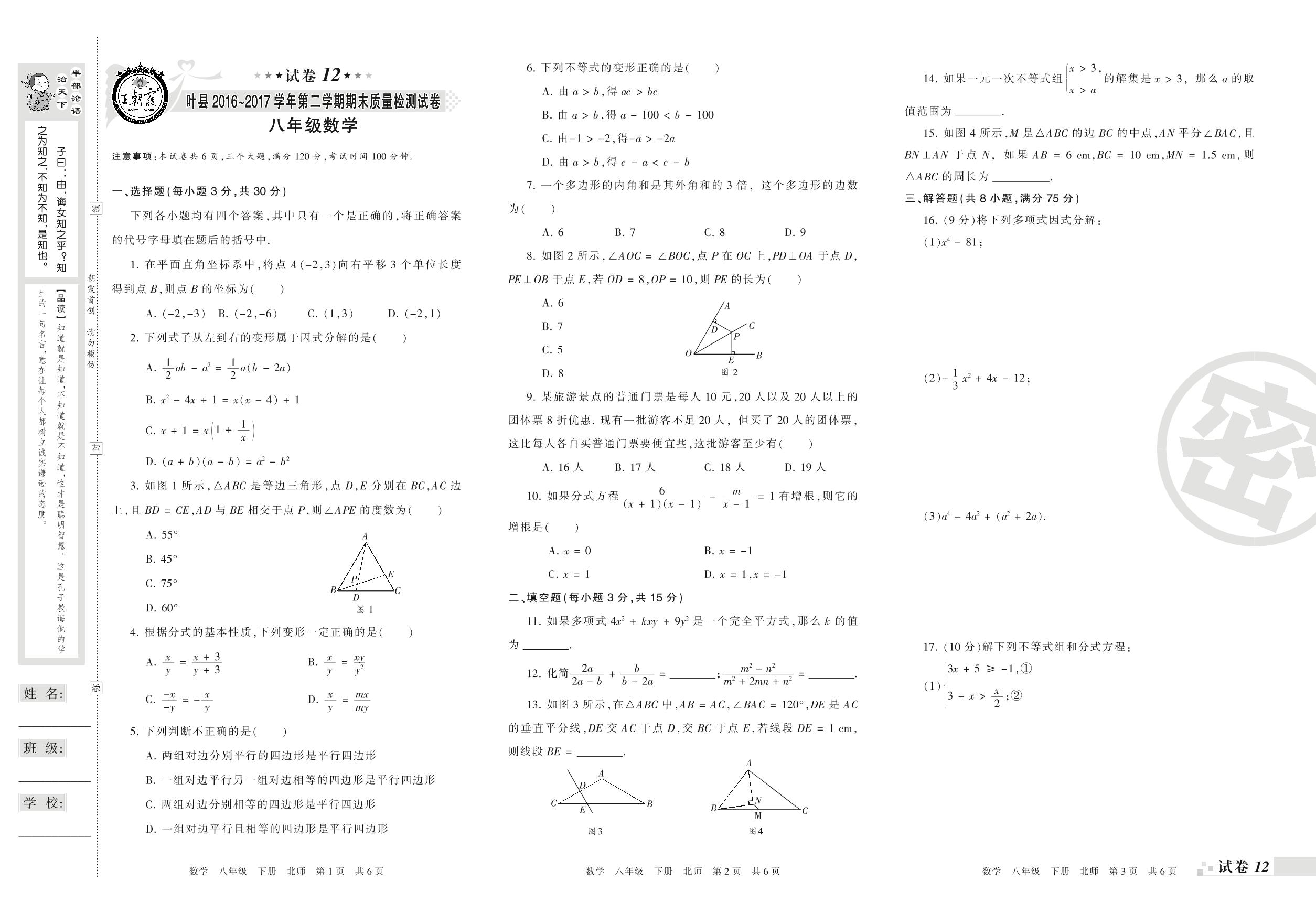 2016-2017学年第二学期平顶山市叶县八年级数学试卷(北师版)【12】