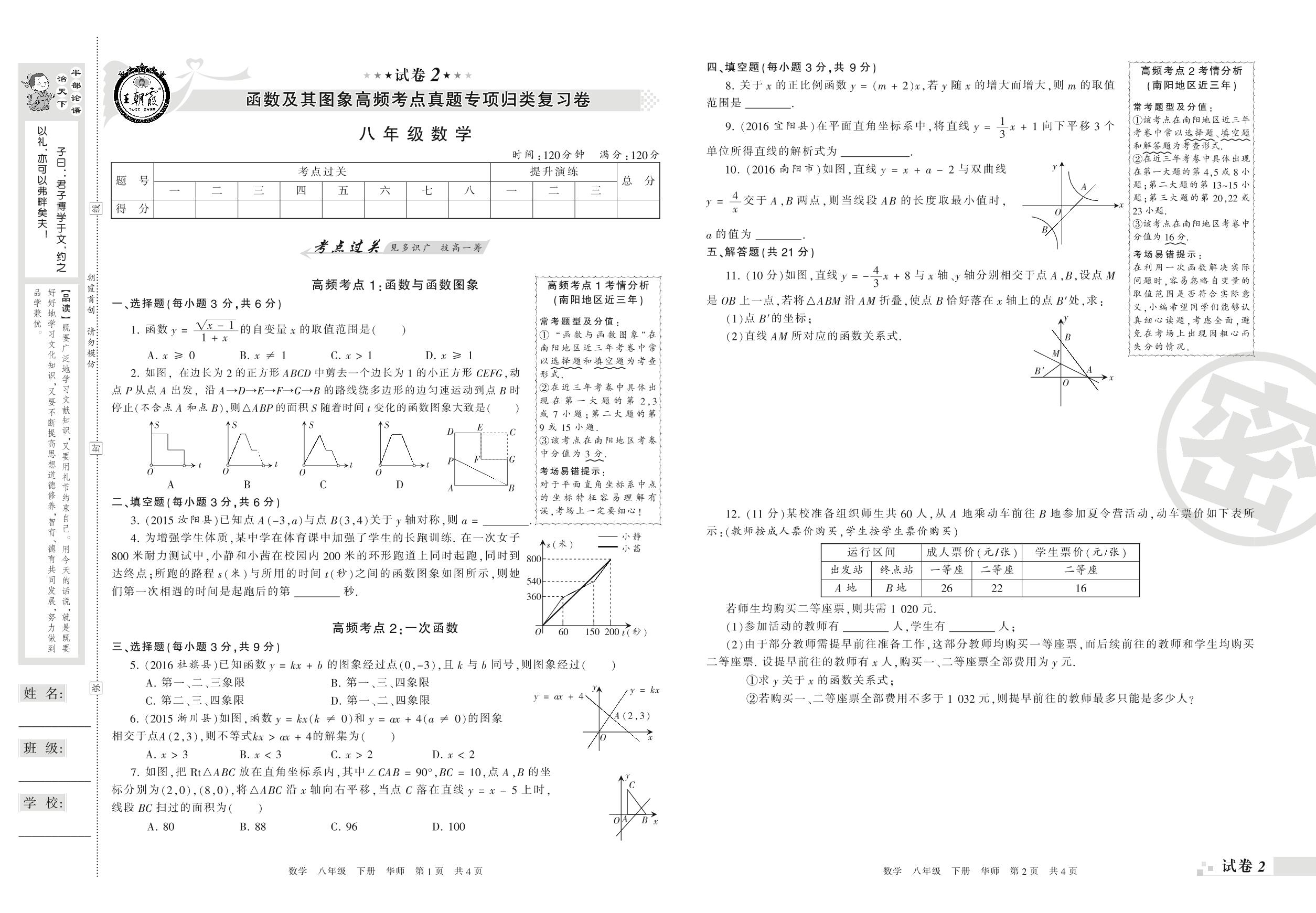 王朝霞期末专项卷——函数及其图象高频考点真题专项归类复习卷八年级下册数学(华师版)【2】