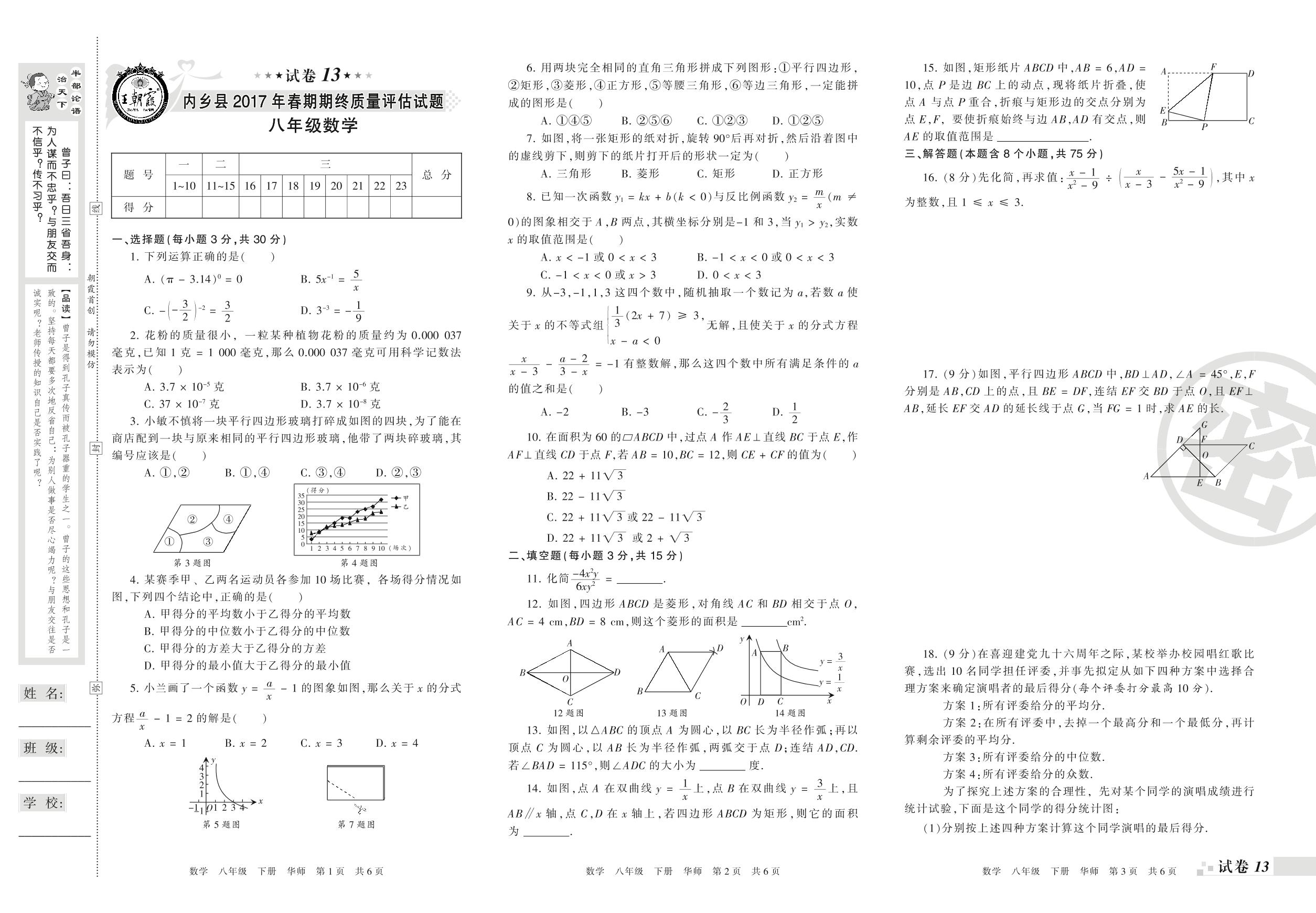 2016-2017学年第二学期南阳市内乡县八年级数学试卷(华师版)【13】