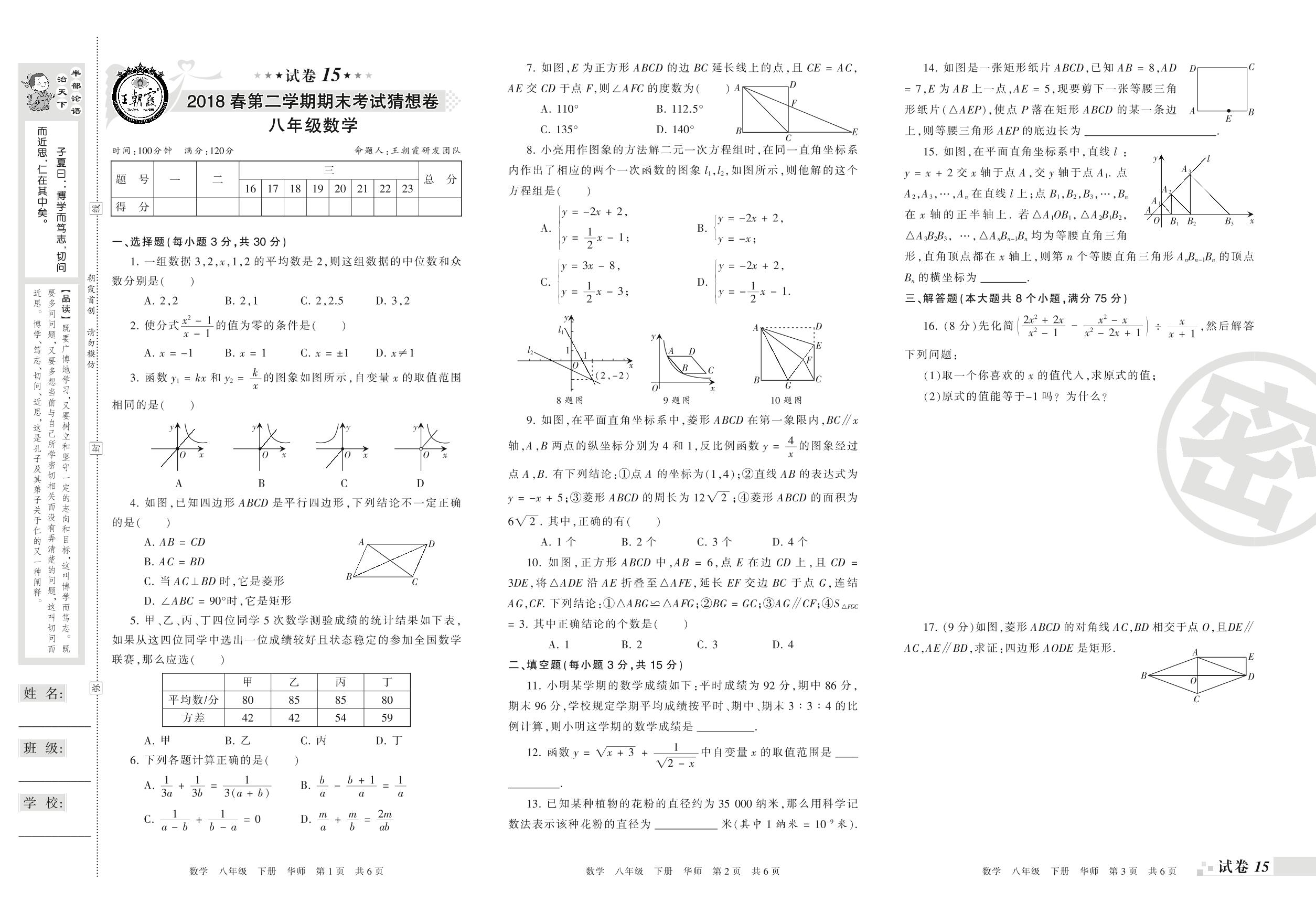 2017-2018学年第二学期期末考试猜想卷八年级数学(华师版)【15】