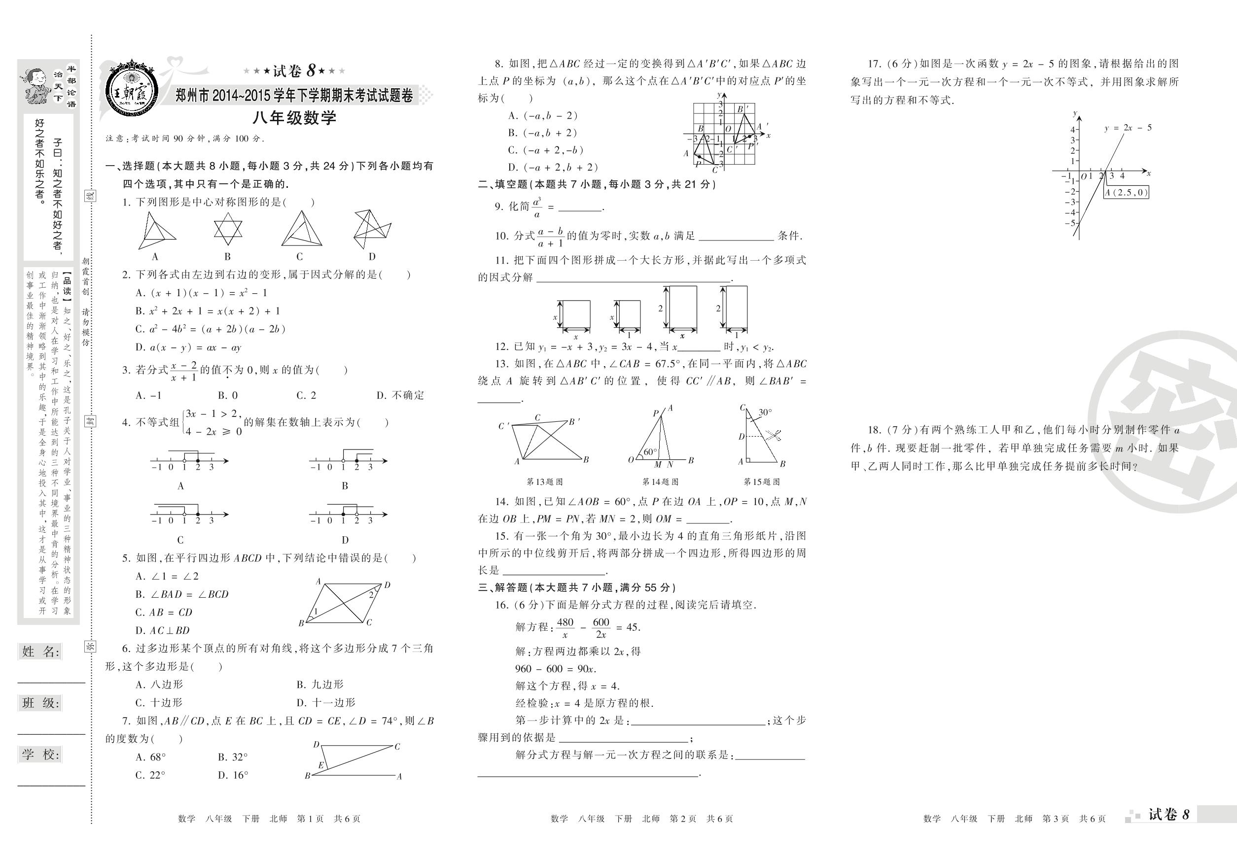 2014-2015学年第二学期郑州市八年级数学试卷(北师版)【8】