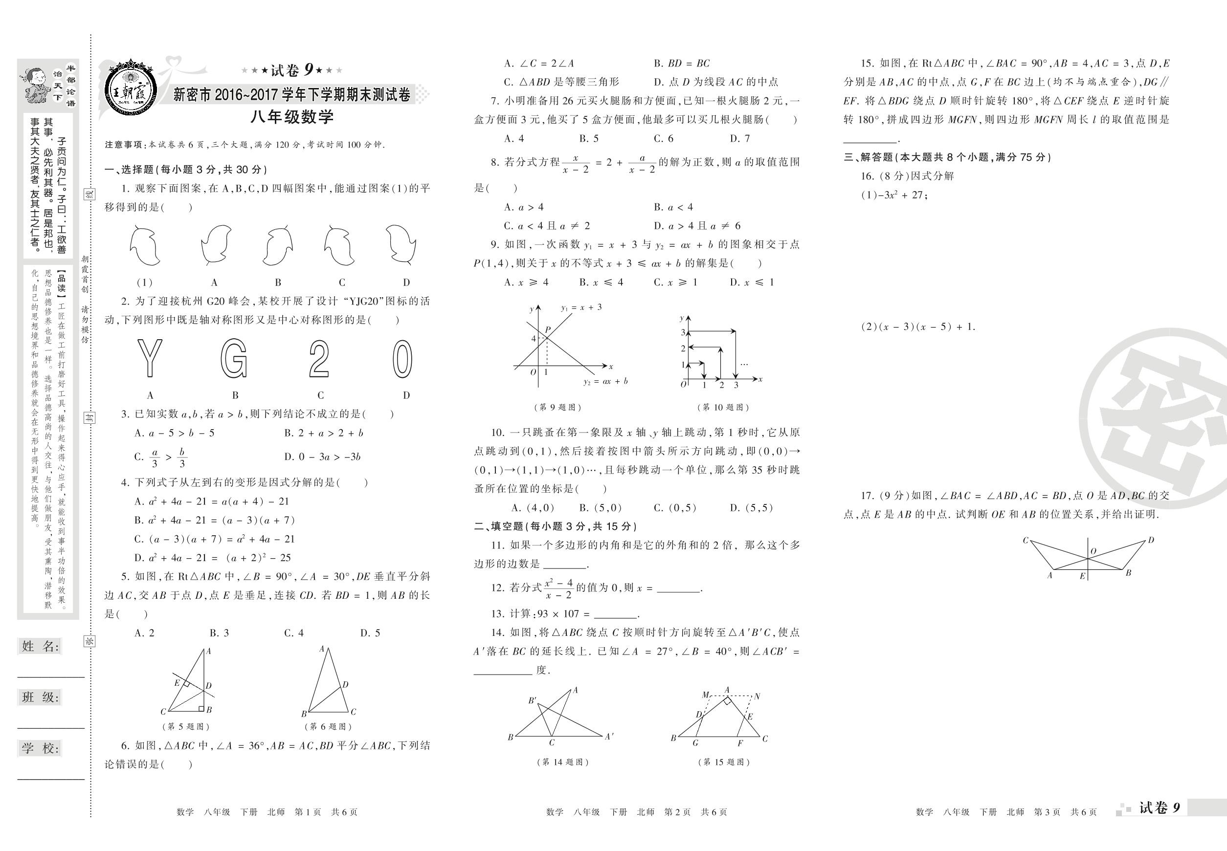 2016-2017学年第二学期新密市八年级数学试卷(北师版)【9】