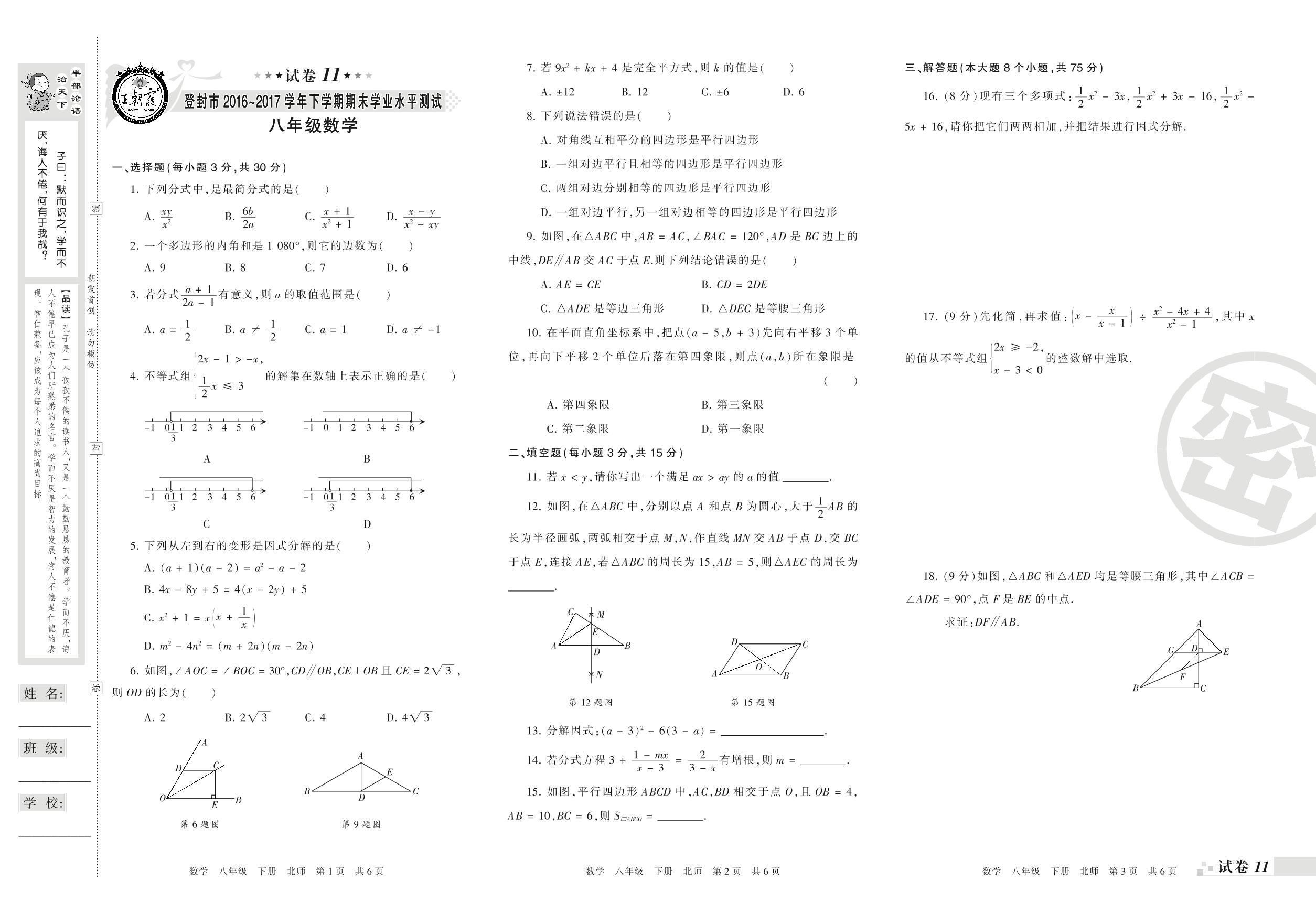 2016-2017学年第二学期登封市八年级数学试卷(北师版)【11】